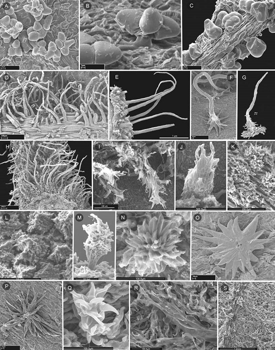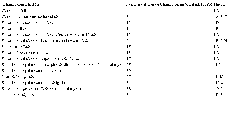 Indumentos. Las especies de Meriania distribuidas en Colombia presentan 15 tipos diferentes de tricomas de acuerdo con el atlas de tricomas presentado para Melastomataceae ( Wurdack, 1986) ( Fig. 1, Cuadro 1). Predominan los tricomas filamentosos de base ensanchada y barbelada (tipo 21) y los alargados o adpresos amorfos de paredes rizadas (tipos 30 y 31). Meriania barbosae Humberto Mend., Alvear & Almeda, M. ramosii (especie nueva descrita aquí; ver abajo), M. selvaflorensis y M. silverstonei Humberto Mend. & Fern. Alonso presentan tricomas glandulares (tipo 6). El indumento varía de ralo a denso, mientras que en M. fantastica Alvear, Humberto Mend. & Almeda, M. hernandi L. Uribe, M. neillii (especie nueva descrita aquí; ver abajo), M. mexiae Wurdack, M. nobilis y M. pastazana Wurdack son glabrescentes o glabras.