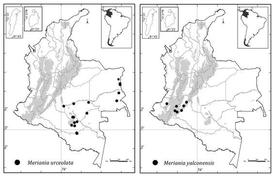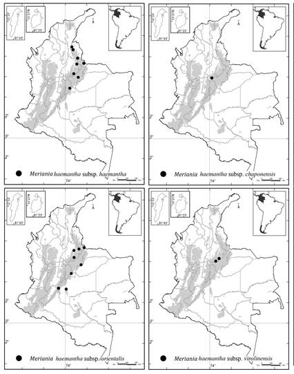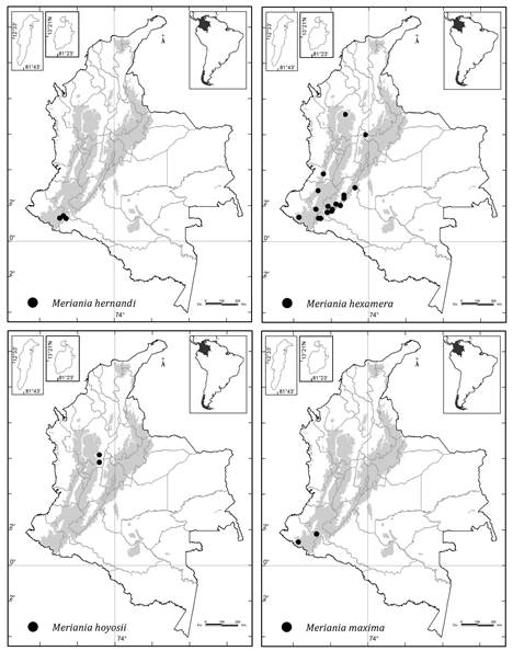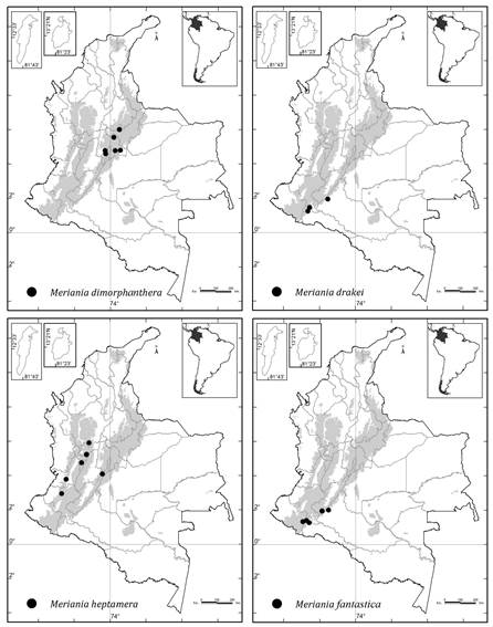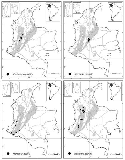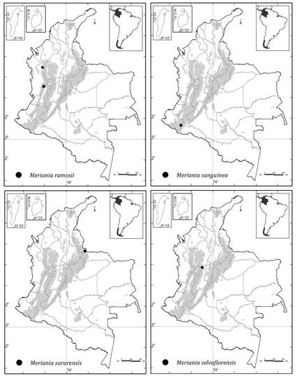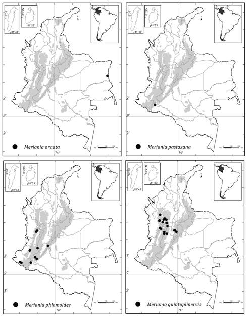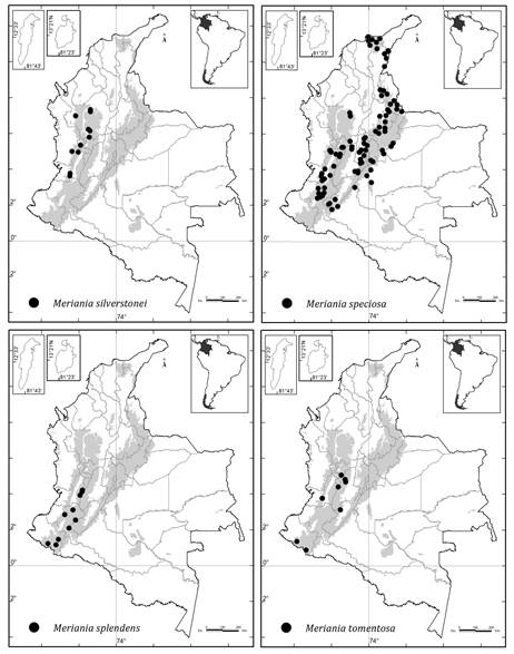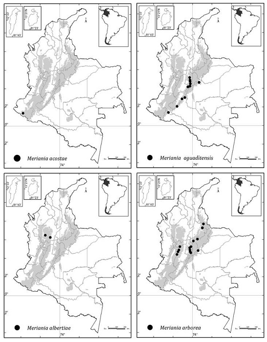 Colombia es el país con más especies (51) de Meriania, seguido por Ecuador (28), Brasil (14) y Venezuela (12) ( Renner, 1999; Calderón y Mendoza, 2000; Mendoza y Ramírez, 2006; Michelangeli y Cotton, 2008; Chiavegatto y Baumgratz, 2009; Baumgratz et al., 2010; Almeda et al., 2016; Fernández-Fernández et al., 2020; Goldenberg et al., 2020).