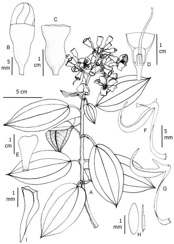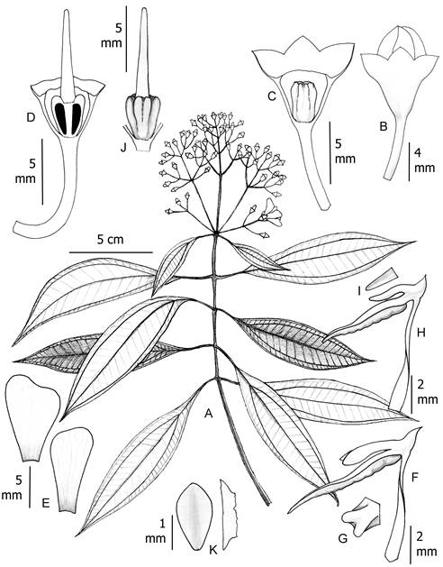 Material examinado: COLOMBIA. Departamento Caquetá, municipio Solano, Araracuara, río Caquetá, sabana de Angostura, 400 m, 21.XII.1951, fl, H. García-Barriga 14159 (COL); Araracuara, sabanas del Yarí, 236 m, 0º14'18.2''N-71º25'43.8''W, 16.II.2011, fr, D. Caicedo 2792 (COAH); Araracuara, alrededores de Araracuara, 10.XI.1982, fl, J. M. Idrobo 11239, 11488 (COAH, COL); Parque Nacional Natural Chiribiquete, serranía norte, 810 m, 29.XI.1992, fl, C. Barbosa 8124 (COL); Parque Nacional Natural Chiribiquete, campamento sur, 300 m, 6.XII.1990, fl, J. Estrada CHIS 45 (COL); Parque Nacional Natural Chiribiquete, cuenca media del río Cuñaré, 350m, 15.XI.2000, fl, H. Mendoza 9434 (FMB) , 9452 (FMB) , 9566 (FMB). Departamento Guaviare, municipio San José del Guaviare, Serranía La Lindosa, quebrada Agua Bonita entre charco La Lindosa hasta La Reserva, 19.III.2008, fr, D. Cárdenas 21398 (COAH); Inspección de Tomachipán, Caño Cocuy, Cerro Cocuy, Parque Nacional Natural Nukak, 350 m, 10.II.1996, fl, M. P. Córdoba 2157 (FMB); Puerta de Orión, 168 m, 23.III.1997, st, R. Córdoba 2333 (COL); Serranía La Lindosa, vereda Nuevo Tolima, 432 m, 24.IX.2012, fr, A. Gonzáles 128 (COAH). Departamento Guinía, municipio Inírida, resguardo La Ceiba - Caranacoa, sector Huesito, carretera Huesito - Caribe, 100-150 m, 22.IV.2004, fl, D. Cárdenas 14695 (COAH); entre Cerros de Mavicure y Chorro Samuro, 1.I.2007, fl, D. Cárdenas 20333 (COAH); comunidad de Caño Vitina, 13.V.2007, fl, D. Cárdenas 20743 (COAH). Departamento Meta, municipio La Macarena, Serranía La Macarena, Caño Cristales, cercanías de la cabaña de CORMACARENA, 270-320 m, 27.XII.2005, fl, J. Betancur 1195 (COL); río Guayabero, Sabanas de arenisca, 235-700 m, I.III.1959, fl, H. García-Barriga 17097 (COL). Departamento Vaupés, municipio Mitú, cabeceras del caño Wacurabá, 200-400 m, 16.V.2006, fr, D. Cárdenas 18742 (COAH); Gran Resguardo Indígena del Vaupés, caño Cuduyarí, 22.VII.2006, fr, D. Cárdenas 19013 (COAH); comunidad de Wacurabá, margen derecho del caño Cuduyarí, sabana de Yapobo, 400 m, 26.IX.2007, fr, D. Cárdenas 21192 (COAH); Río Karurú, Mesa de Yambí, 950-1000 ft, 15.IV.1933, fr, R. E. Schultes 19140 (COL). Departamento Vichada, municipio Cumaribio, Selvas de Matavén, Resguardo Unificado Selvas de Matavén, Caño Carajo, 240 m, 16.III.2007, fl, A. Prieto 5438 (FMB); Selvas de Matavén, Resguardo Unificado Selvas de Matavén, sector Caño Zama, 300 m, 6.III.2007, st, A. Prieto 6013 (FMB). Municipio Puerto Carreño, Vereda La Esmeralda, finca El Tomo, confluencia del Caño Terecay con el río Tomo, flanco norte, 85 m, 05°33'48,3''N- 68°27'20,6"O, 04.IV.2017, fl, fr, H. Mendoza 19860 (FMB), 19861 (FMB).