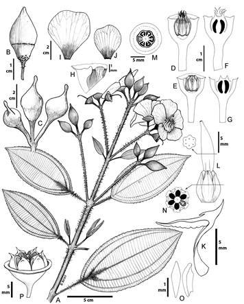 Meriania yalconensis Humberto Mend. & Fern. Alonso, Anales Jard. Bot. Madrid 69(2): 289-292. 2012. Fig. 65. TIPO: COLOMBIA. Departamento Huila, municipio San Agustín, vereda La Castellana, Reserva Natural Privada Los Yalcones, interfluvio quebradas El Palmar - Río Balseros, sito El Palmar, 2400-2600 m, 15.VIII.2005, fl, H. Mendoza 16439 (holotipo: FMB!; isotipos: COL!, HUA!).