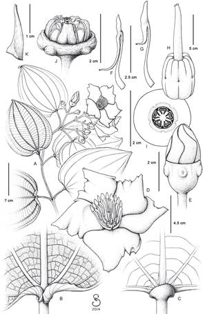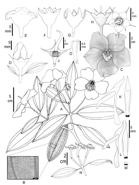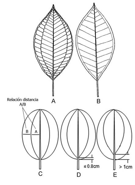 Nervadura. En todas las especies de Meriania es acródroma. No obstante, en algunas especies como M. neillii las venas secundarias se despliegan hacia el margen, lo que le confiere apariencia broquidódroma. La disposición de las venas secundarias varía entre basal y plinervia (suprabasal) ( Fig. 2). La nervadura terciaria no presenta mayor variación, excepto en M. speciosa (Bonpl.) Naudin, donde las venas aledañas a la vena media se anastomosan en la mitad de su recorrido formando un retículo que se asemeja a la línea de prefoliación típica de Erythroxylum P. Browne, denominada como “nervadura eritroxiloide”. La distancia que se encuentra entre la vena media, las venas secundarias próximas a la vena media y el margen, es una medida utilizada algunas veces como un carácter taxonómico, por lo que es importante medirla solo en la de la mitad de la lámina foliar ( Fig. 2C).