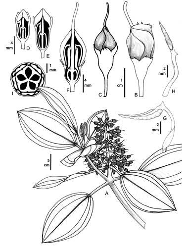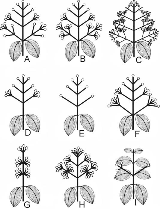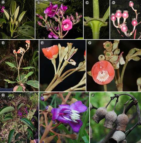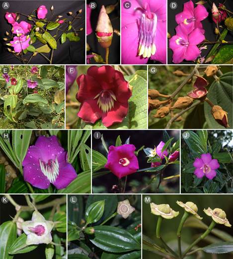 Inflorescencias. Corresponden a panículas tirsoides, abiertas o con ramificaciones atrofiadas, terminales, con pocas a abundantes flores ( Fig. 3). Se presentan variaciones inter e intraespecíficas dadas por la reducción de los ejes y los entrenudos. Meriania hoyosii y M. speciosa son las únicas especies en Colombia que no comparten esta arquitectura. La primera presenta inflorescencias umbeliformes, laterales o terminales, mientras que la segunda presenta inflorescencias unifloras o trifloras, laterales o terminales. En M. phlomoides hay brácteas foliáceas caducas que protegen la inflorescencia en sus primeras etapas de desarrollo. Todas las especies tienen inflorescencias erectas, excepto Meriania arizae, M. mexiae, M. sararensis y M. selvaflorensis que las tienen péndulas.