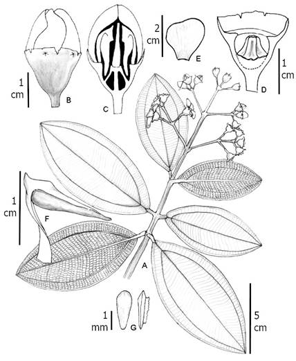 Material examinado: COLOMBIA. Departamento Cauca, municipio Argelia, Cerro Plateado, vertiente hacia la quebrada Soledad, 2600 m, 30.III.1995, fl, M. L. Becking 2515 (CAUP); Cerro Plateado, vertiente hacia la quebrada Soledad, 2600 m, 30.III.1995, fl, M. L. Becking 2514 (COL). Departamento Huila, municipio Palestina, vereda La Guajira, Reserva Natural Comunitaria La Rivera, 1970 m, 28.VIII.2005, st, A. Prieto 4082 (FMB). Municipio Salado Blanco, Parque Nacional Natural Puracé, El Palmar, sector Granates, 2191 m, 23.VI.2003, st, S. Medina 139 (FMB). Municipio San Agustín, vereda La Castellana, Reserva Privada Los Yalcones, Sector Yalcones, 2400-2600 m, 15.VIII.2005, st, H. Mendoza 16344 (FMB), 16361 (FMB). Municipio Suaza, Cordillera Oriental, vertiente occidental, entre Gabinete y Andalucía, 2200-2300 m, 25.III.1940, fl, fr, J. Cuatrecasas 8684 (F 1235803, COL, NY, US); Cordillera Oriental, 1 km NW and W of finca Ventanas, 15 km SE of Gigante, 8900 ft, 14.IX.1944, fl, E. L. Little jr. 8654 (NY). Departamento Putumayo, municipio Colón, Reserva Natural La Rejoya, 2650 m, 27.XII.1996, fl, B. Ramírez 10328 (PSO). Municipio Sibundoy, entre San Francisco y Río Blanco, 2300-2800 m, 9.IV.1973, fl, J. J. Hernández 414 (PSO); loc. cit., 2200 m, 2.XI.1979, fl, O. Salazar de Benavides 2072 (PSO).