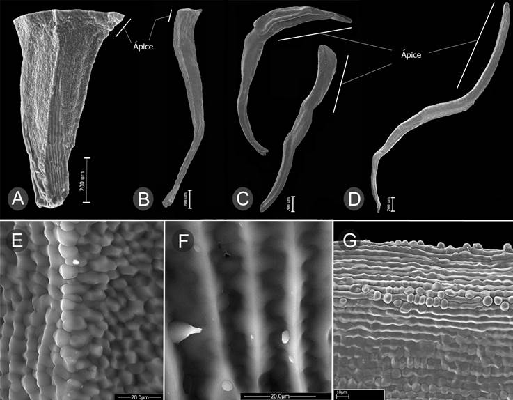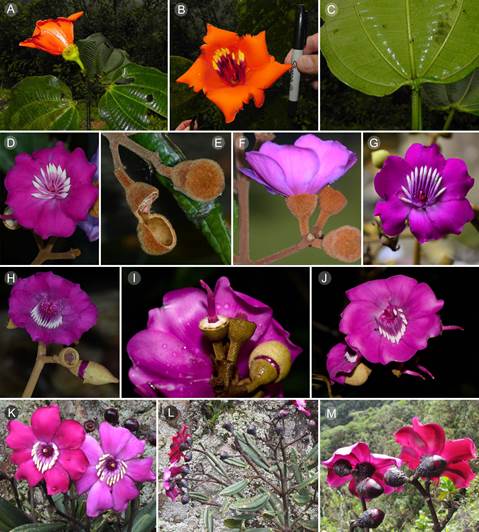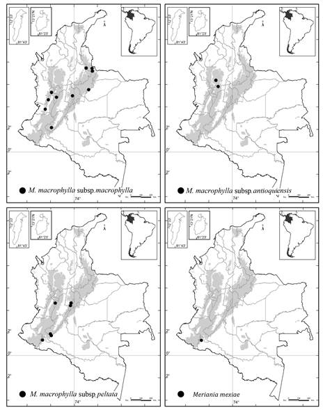 Para realizar las descripciones se tomaron medidas a partir de material seco y rehidratado. Se capturaron microfotografías de tricomas, semillas y polen en un microscopio electrónico (SEM) (Hitachi S-50, Schaumburg, IL, EUA) en el Departamento de Botánica de la Academia de Ciencias de California, Estados Unidos de América. De cada una de las especies consideradas se establecieron descripciones, ilustraciones, mapas de distribución y, en la medida de las posibilidades, imágenes de campo. Se describieron los tipos de tricomas con base en el Atlas de Tricomas de Melastomataceae ( Wurdack, 1986). En el caso de una especie ( Meriania macrophylla (Benth.) Triana), donde se proponen nuevas subdivisiones infraespecíficas, se incluyen descripciones de algunas subespecies de otros países.