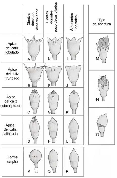 Cáliz. Puede ser lobulado, truncado, subcaliptrado o caliptrado. Los dientes pueden ser conspicuos, levemente desarrollados o ausentes. En los cálices caliptrados o subcaliptrados, la apertura puede darse de forma regular (cuando hay rompimiento hacia el ápice y se generan lóbulos en igual número al de los pétalos), irregular o circuncísil ( Fig. 4).