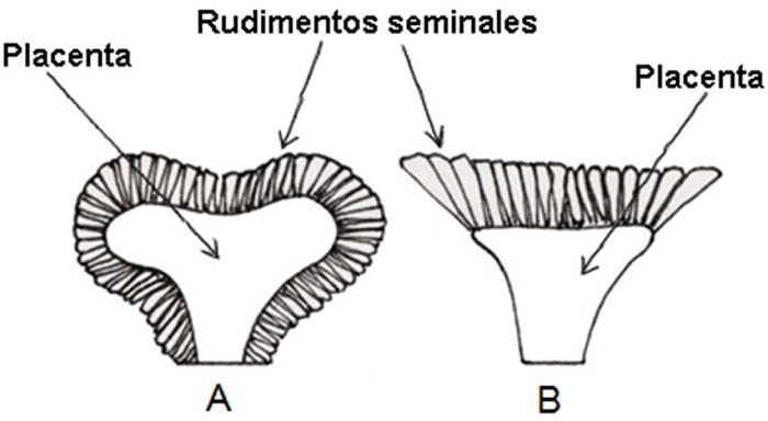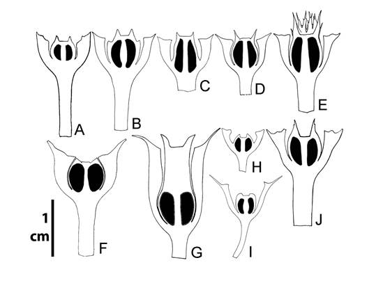 Ovario y estilo. En Meriania el ovario puede estar fusionado al hipanto en su parte basal o ser completamente libre. El número de lóculos varía entre 3 y 7 y, regularmente, puede variar dentro de la misma especie. Las placentas son ovoides y en corte horizontal tienen forma de “T” o “Y.” Los rudimentos seminales se encuentran en toda la superficie de la placenta, excepto en M. albertiae, M. ornata y M. urceolata ( Fig. 8). En las flores abiertas el estilo es curvo regularmente hacia el ápice; el estigma puede ser no expandido (puntiforme), levemente expandido (a manera de glande) o expandido a manera de disco (discoide).
