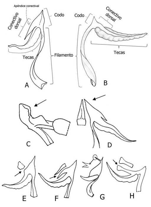 Estambres. En Meriania se presentan estambres isomorfos o leve a fuertemente dimorfos ( Mendoza-Cifuentes y Fernández-Alonso, 2010). Cuando los estambres son dimorfos, entonces los opositipétalos son los más grandes, excepto en Meriania selvaflorensis. En las flores abiertas, los estambres se disponen de forma zigomorfa respecto a la corola ( Figs. 5A, C). El conectivo dorsal puede presentar un apéndice conspicuo o no. En caso de tener apéndice, este es abultado, tuberculado, dentiforme, subulado o cilíndrico con el ápice abultado. La antera es subulada y regularmente sigmoidea. En algunos casos, los estambres presentan pedoconectivo, que es una porción basal del conectivo libre de las tecas. El poro de la antera en los estambres opositipétalos siempre se orienta dorsalmente, mientras que en los estambres opositisépalos la orientación puede ser dorsal, ventral o apical.