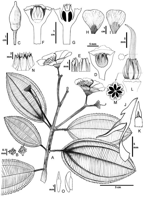 Árboles 10-15 m de altura; entrenudos subcuadrangulares; ramas, pecíolos, inflorescencia con indumento denso de tricomas filiforme de paredes rizadas (tipo 17), ápice de las ramas con tricomas piramidales diminutos (tipo 27); hojas con pecíolo 1.8-3.4 cm de largo; lámina 10-17.5 × 5.5-8.5 cm, ovado-elíptica a elíptica; base redondeada a levemente cordada (levemente peltada en juveniles), revoluta; ápice agudo a obtuso; margen espaciadamente denticulado; haz glabro; envés con indumento ferrugíneo denso sobre la nervadura de tricomas filiforme de paredes rizadas 0.1-0.3 mm de largo (tipo 17), esponjosos subtriangulares aplanados lateralmente de paredes rizadas (tipo 30), también tricomas setosos hasta 2.5 mm de largo (tipo 11) en las axilas de las venas secundarias; nervadura con 2 pares de venas principales acompañando a la vena media, levemente plinervias 1-3 mm arriba de la base; inflorescencia 10-16 cm de largo, 15-34 flores, 2-3 nudos de ramificación; paracladios basales con 1-2 niveles de ramificación; ramillas apicalmente trifloras o con 4-5 flores por los entrenudos muy cortos; flor pedicelada, 7-8-mera; pedicelo 6-13 mm de largo, terete, algunas veces con ralos pelos setosos; hipanto 6-7 mm de largo, ciatiforme; pared 1.5-1.9 mm grosor en su parte media; en la parte interna ribetes gruesos frente a los pétalos 1-13 mm de ancho, 5-5.5 mm de largo, sobresaliendo cerca de 1 mm arriba el torus; externamente indumento denso de tricomas esponjoso irregular con ramas cortas 0.1-0.2 mm de largo (tipo 30), rufos, también cuerpos globulares esponjosos, suculentos; cáliz caliptrado, caliptra 14-23 mm de largo, ápice agudo o apiculado, externamente con el mismo indumento al del hipanto; corola patente; pétalos 29-42 × 23-34 mm, obovados, de ápice truncado emarginado, glabros, fucsia oscuro; estambres isomorfos, filamento 9-12 mm de largo; codo 3.9-4.2 mm de largo; apéndice conectival dorsal 0.9-1.1 mm de largo, subulado; antera 7.5-10.2 mm de largo, sigmoidea, poro dorsal; polen 10.8-11 μm diámetro; ovario 6.2-8.5 mm de largo, 7-8-locular, ovado, en corte transversal en su parte media tiene 7-8 costillas levemente alzadas, lomo levemente aplanado, fusionado en la base con el hipanto 1.2-2 mm; ápice 2.7-3.4 mm de largo, apéndices apicalmente dentados; placentas 2.8 mm de largo, ovoides, rudimentos seminales en todas las superficies; estilo 10.5-15.3 mm de largo, columnar a levemente cónico, retorcido, levemente curvo en la base; estigma levemente glandiforme; cápsula 9-12 mm de largo sin el pedicelo, hipanto hemisférico, ovario sobresaliendo 0.4-0.5 mm; pedicelo 0.9-10 mm de largo; semillas cuneiformes, ápice corto (visto en semillas inmaduras).