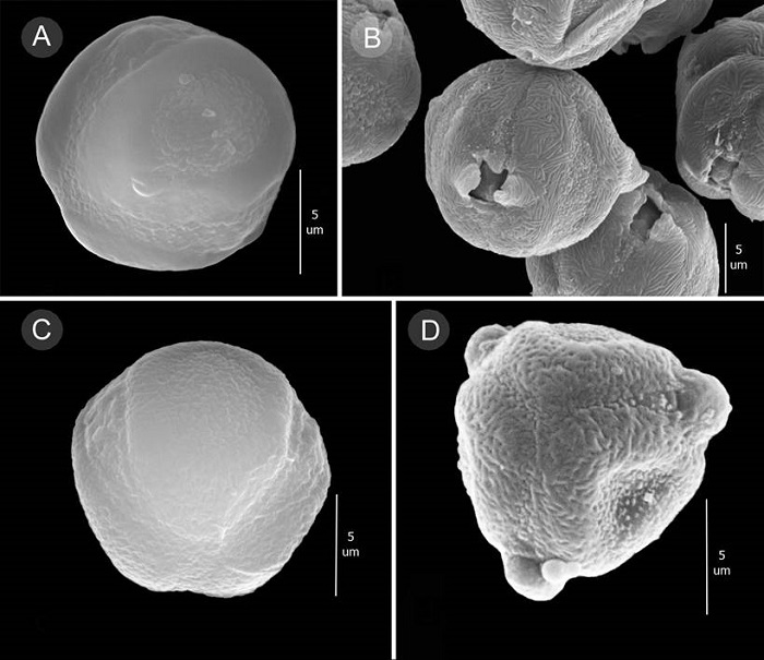 Polen. Las especies colombianas de Meriania tienen granos esféricos en vista ecuatorial y triangular-convexos en vista polar, de 10.5-16.1 μm de diámetro, radiosimétricos, isopolares, tricolporados, sincolpados y con exina rugulada ( Fig. 7).