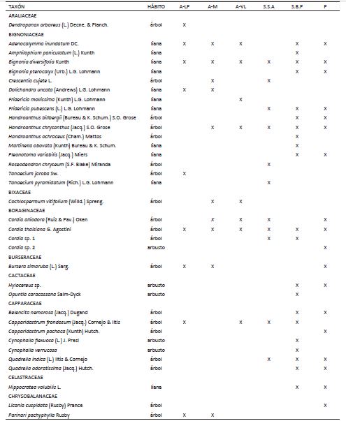 Key results: One hundred ninety-one species were registered, distributed in 52 families, the most represented being Fabaceae (47) and Bignoniaceae (16). The most frequent species was Handroanthus chrysanthus and the growth habit was the tree (65%). The non-parametric Bootstrap indicator was the most suitable for the number of expected species, providing a completeness percentage of 87.26%. The precipitation data were not correlated significantly (R=0.53 y P=0.27) with the total richness inventoried.
