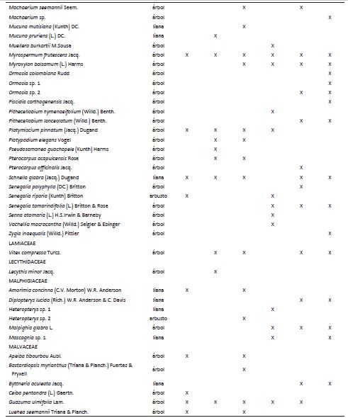 La familia Fabaceae fue la más dominante en el estudio; la cual es uno de los grupos con mayor diversidad y amplia distribución en los trópicos (Gentry, 1995). Sus características morfológicas reportadas, tales como hojas compuestas, presencia de espinas y tricomas, entre otras (Gentry, 1996), disminuyen la exposición a la radiación solar y les permiten soportar la sequía (Ceroni, 2003). Algunos integrantes también tienen la capacidad de regular la concentración de nitrógeno en el suelo (Herrera et al., 2017). Este es un aspecto importante, ya que la intensificación de los ciclos hidrológicos (sequía-lluvia) están relacionados con las variaciones de sus concentraciones (Morillas et al., 2015), lo cual puede sugerir que estas especies podrían ser utilizadas en procesos de restauración frente a escenarios drásticos de cambio climático (Herrera et al., 2017).