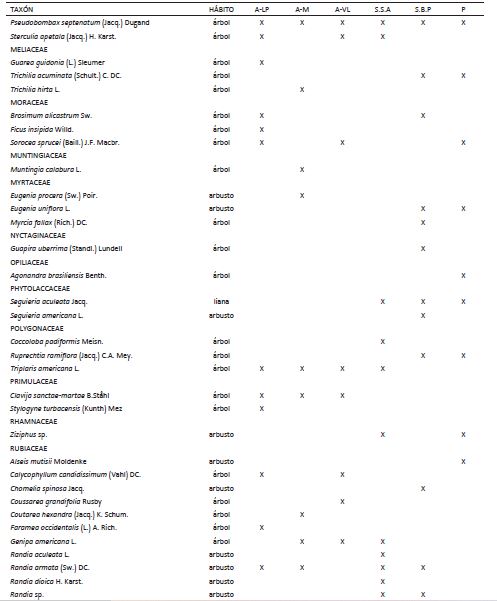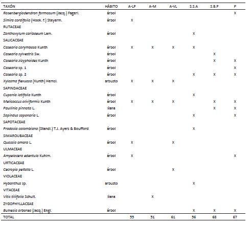 El listado de especies entre los seis fragmentos, ubicados en cuatro municipios estudiados en el departamento Magdalena, permite conocer el estado actual del BST en un periodo de baja precipitación, siendo los resultados obtenidos con DAP ≥2.5 cm bajos en comparación con otras localidades del Caribe colombiano con el mismo diámetro en 0.1 ha, no obstante, las fincas Tacaloa (62 especies) en el municipio Plato, y Villa Lorena (59 en el municipio Aracataca, superaron lo reportado en los municipios Galerazamba (55) y Tierra Bomba (56) en el departamento Bolívar (Mendoza, 1999). Al contrastar con datos reportados con DAP ≥1 cm en un estudio en los Montes de María en el departamento Sucre en 0.1 ha (Paraíso con 120 (municipio Colosó), Pajarito con 110 (municipio Chalán), Garrapata con 104 (municipio San Onofre), El Cacao con 111 (municipio San Onofre) y Roca Madre con 122 (municipio Toluviejo), Herazo et al., 2017), realizado en distintas épocas, sus resultados superaron lo encontrado en este estudio, posiblemente por el cubrimiento estacional.