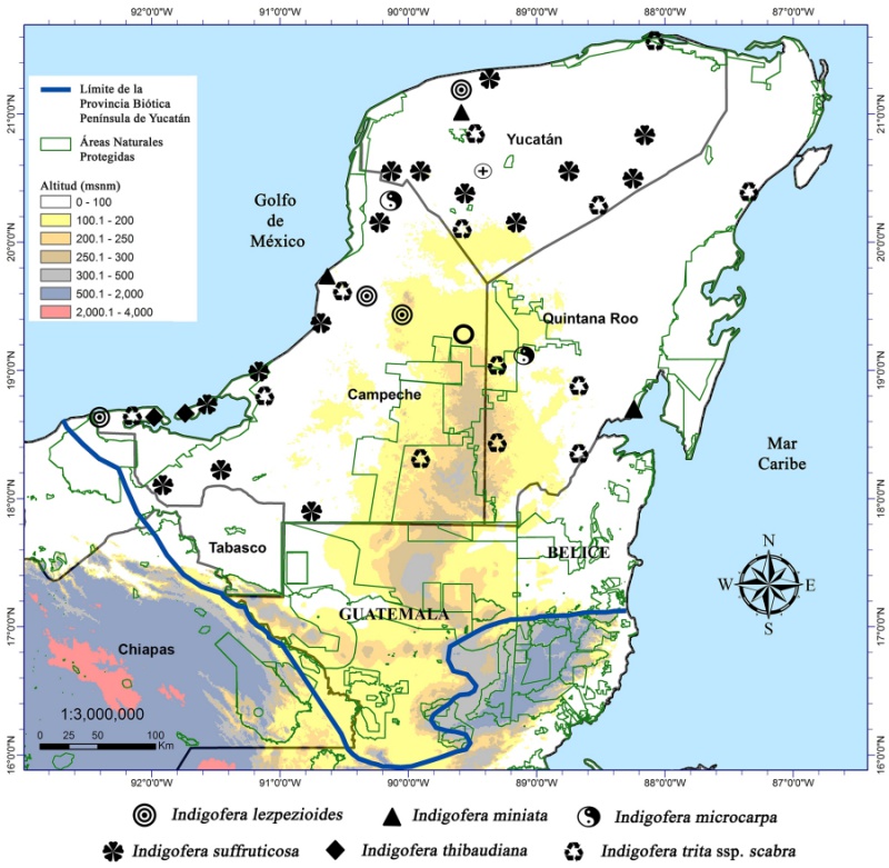 Background and Aims: In the Mexican Yucatán Peninsula, up to seven species of the genus Indigofera have been reported: I. indica, I. jamaicensis, I. lespedezioides, I. suffruticosa, I. thibaudiana, I. tinctoria and I. trita subsp. scabra. The purpose of this study is to evaluate the diversity of the genus in the peninsula, Campeche, Quintana Roo, and Yucatán.