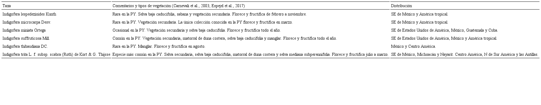 Resultados clave: Se adicionan dos nuevos registros para la Península de Yucatán: Indigofera microcarpa e I. miniata. Por otro lado se excluyen I. indica, I. jamaicensis e I. tinctoria. Se realizan comentarios taxonómicos y ecológicos sobre las especies, se incluye una clave diagnóstica, un mapa de distribución e imágenes de algunas especies en su medio natural.