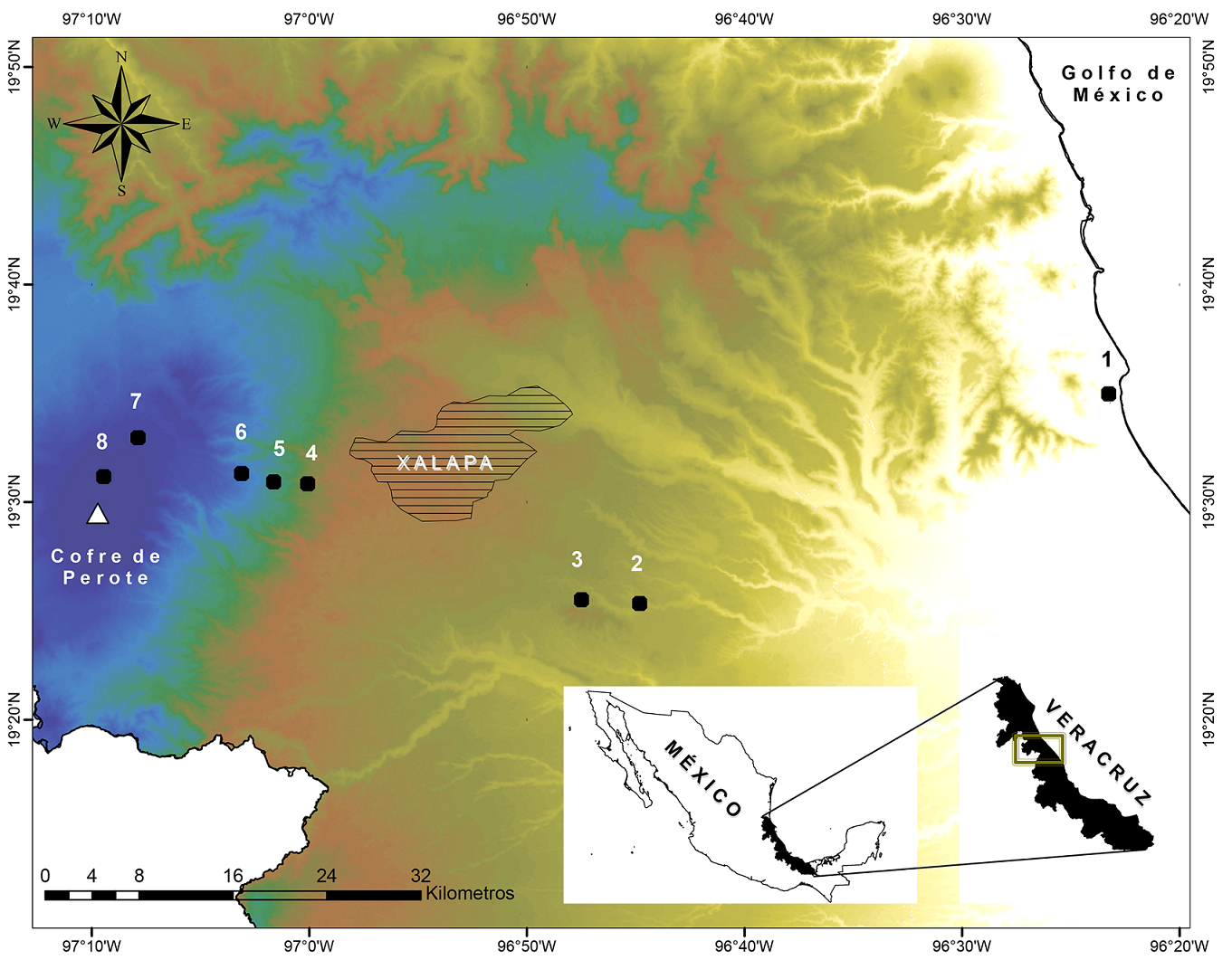 El gradiente altitudinal se ubica en la región central del estado de Veracruz y se extiende en dirección este desde el nivel del mar, en la zona de La Mancha, hasta la parte alta del volcán Cofre de Perote a 3500 m s.n.m. (Fig. 1). La zona superior a 1500 m forma parte del Cinturón Volcánico Transmexicano, mientras que en las partes bajas se encuentran pequeños lomeríos, así como la Sierra de Manuel Díaz, una formación montañosa ubicada frente al mar. Finalmente, a nivel del mar se encuentran las lagunas costeras “La Mancha-El Llano”, que forman parte de la zona decretada como sitio Ramsar (Geissert y Enríquez, 2011; Carvajal-Hernández y Krömer, 2015).
