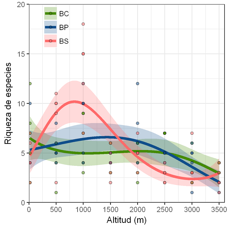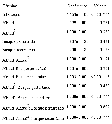 Utilizamos modelos lineales generalizados (MLGs) para examinar la relación entre la riqueza de especies con la elevación y el hábitat. Los MLGs son una extensión de los modelos lineales simples que permiten modelar los datos usando otras distribuciones distintas a la Normal. La elección de la distribución afecta las suposiciones que se hacen respecto a las variaciones, ya que la relación entre la varianza y la media es conocida para muchas distribuciones (Guisan et al., 2002). Debido a que la variable dependiente no siguió una distribución normal, se eligió una estructura de error adecuada a la naturaleza de esta variable. Elegimos la estructura de error binomial negativo para el MLG con la función “descdist” del paquete R “fithistrplus” versión 1.0-7 (Delignette-Muller et al., 2017). Para incluir una relación no lineal de la variable dependiente con la altitud, se incluyó un término cuadrático. Utilizamos como variables independientes elevación, elevación2, hábitat y sus interacciones de dos y tres vías en estos modelos. Se construyeron seis MLGs con diferentes combinaciones de las variables independientes. Usando el criterio de información de Akaike corregido por sesgos (AICc), se identificó el MLG que mejor explicase la riqueza de especies. Finalmente, se calculó el D2 del mejor modelo. Todos los análisis se realizaron en R versión 3.3 (R Core Team, 2017).