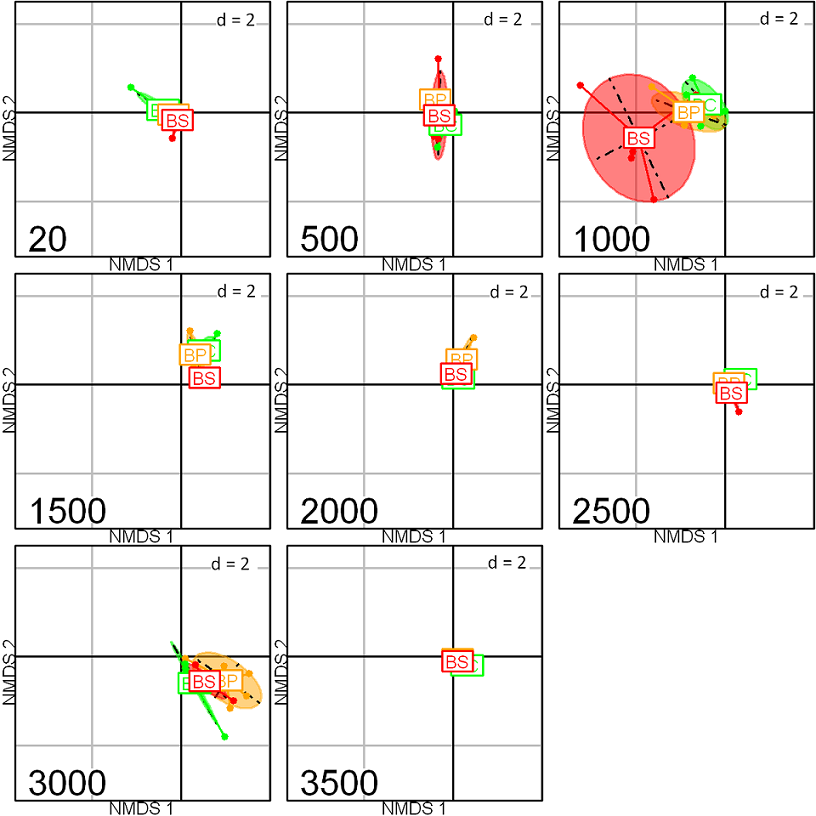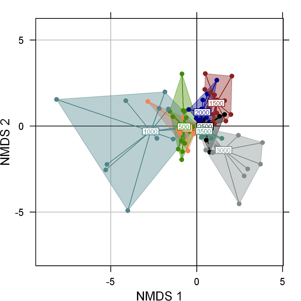 Para explorar los patrones de la distribución de la diversidad de especies entre los pisos elevacionales y hábitats, se realizó un escalamiento multidimensional no-métrico (NMDS, por sus siglas en inglés), utilizando la matriz de distancia euclidiana de la abundancia de las especies. Este método de ordenación multivariante se basa en la proximidad entre objetos y permite reducir la dimensionalidad de los datos sin una transformación a priori (Clarke, 1993). El método NMDS es reconocido por los ecólogos como un método no paramétrico robusto para la representación de los valores globales de rotación dentro de una matriz en un espacio de baja dimensión (Faith et al., 1987). Se produjeron gráficos de NMDS para cada piso elevacional utilizando las matrices de distancia. Los ejes de las figuras resultantes están en unidades arbitrarias donde los hábitats similares se encuentran uno cerca del otro en el espacio bidimensional y los hábitats menos similares se encuentran más separados.