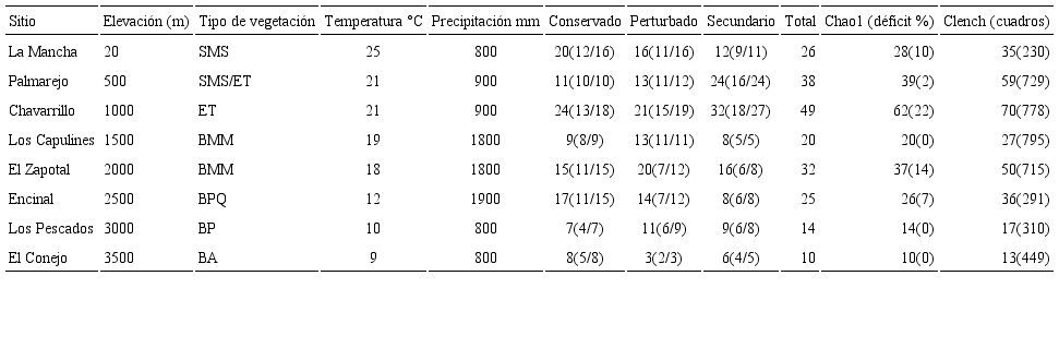 La riqueza estimada de especies de arbustos para Veracruz es de 1527 (Castillo-Campos et al., 2011), por lo tanto, las 118 especies y 14 morfoespecies registradas en este estudio representan aproximadamente 8.6% de la riqueza total del estado. Los valores de las especies observadas son cercanos a los estimados por Chao1 (en general más de 80%), lo cual indica un muestreo satisfactorio. El déficit observado en el piso elevacional de 1000 m se debe al alto número de taxa únicos y duplicados; sin embargo, los valores del modelo de Clench sugieren que para alcanzar la asíntota se necesitaría incrementar entre 15 y 50 veces más el número de cuadrantes (Cuadro 1). Por lo tanto, se considera que, a pesar del número de muestras reducido, el muestreo es satisfactorio ya que las especies registradas por piso elevacional representan entre 64 y 82% de las especies estimadas por el modelo.