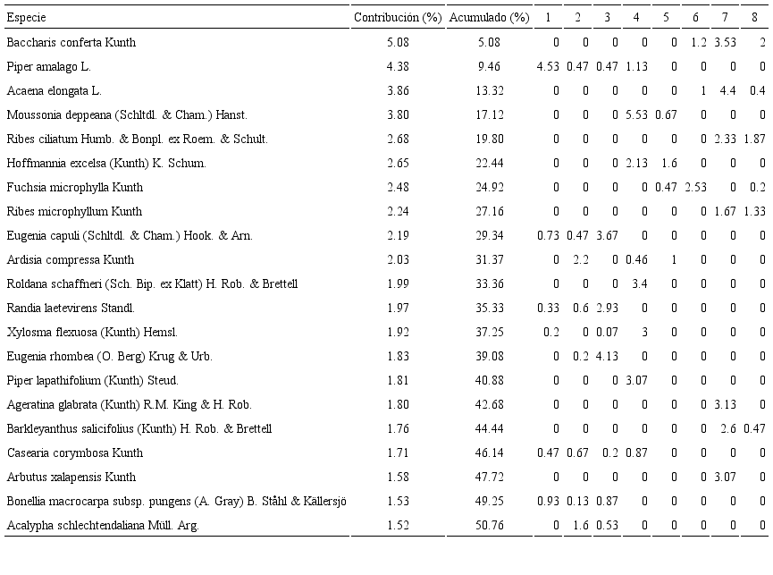 Los valores del análisis SIMPER muestran que, de las 132 especies de arbustos registradas, únicamente 21 contribuyen con 50% a la disimilitud y agrupamiento de las elevaciones según el origen de las especies y tipo de vegetación (Cuadro 3). Las elevaciones bajas (20, 500 y 1000 m) están separadas principalmente por ocho especies exclusivas de la selva mediana subcaducifolia y encinar tropical. Entre las principales están Piper amalago L. con la mayor contribución de 4.53 en la selva mediana subcaducifolia del piso de 20 m, seguido de Eugenia capuli (Schltdl. & Cham.) Hook. & Arn. y Randia laetevirens Standl., quienes tienen mayor contribución en el encinar tropical de 1000 m. Las elevaciones intermedias (1500-2000 m) se separan principalmente por seis especies exclusivas de bosque mesófilo de montaña, donde Moussonia deppeana (Schltdl. & Cham.) Hanst., Hoffmannia excelsa (Kunth) K. Schum., Roldana schaffneri (Sch. Bip. ex Klatt) H. Rob. & Brettell y Piper lapathifolium (Kunth) Steud. tienen su mayor contribución en el bosque mesófilo de 1500 m. Por otro lado, se encuentran las especies exclusivas de bosques templados de las elevaciones de 2500, 3000 y 3500 m (bosque de Pinus-Quercus, Pinus y Abies), de las cuales Baccharis conferta Kunth, Acaena elongata L. y Ribes ciliatum Humb. & Bonpl. ex Roem. & Schult. son las que contribuyen más a la disimilitud de estos bosques teniendo su mayor aporte en el bosque de Abies de 3000 m (Cuadro 3).