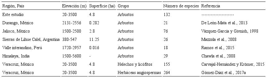 El número de especies de arbustos registrado en este estudio resulta alto (132 especies) si se compara con los resultados de otros gradientes elevacionales realizados en algunos estados de México y otros países (p. ej. Vázquez-García y Givnish, 1998; Chawla et al., 2008; Mazzola et al., 2008; De León-Mata et al., 2013; Ramos et al., 2015) (Cuadro 4). La baja riqueza de los otros estudios se debe a la corta longitud de sus gradientes, menor superficie y menos tipos de vegetación muestreados. Al contrario, en este estudio se muestreó mayor superficie (4.8 ha) y un gradiente completo, es decir, desde el nivel del mar hasta las partes altas de las montañas, además de incluir más tipos de vegetación y heterogeneidad ambiental. Sin embargo, si contrastamos la riqueza de arbustos con las 155 especies de helechos y licófitos reportadas por Carvajal-Hernández y Krömer (2015) y sobre todo las 264 especies de herbáceas angiospermas registradas por Gómez-Díaz et al. (2017a) en el mismo gradiente, esta resulta baja. Estos últimos grupos tienen más disponibilidad de nichos por su menor tamaño, además de crecer sobre el suelo, rocas y, en el caso de muchos helechos epífitos, sobre los árboles. Así, estos dos grupos se ven favorecidos por las temperaturas templadas y altos niveles de precipitación y humedad ambiental que brinda el bosque mesófilo, razón por la cual la mayor riqueza de ambos grupos se registró en elevaciones intermedias, contrario a lo observado en arbustos, los cuales se benefician por la estacionalidad que actúa sobre la fenología de la vegetación y los climas cálido-secos que propician su crecimiento (Rzedowski, 2006; Challenger y Soberón, 2008).