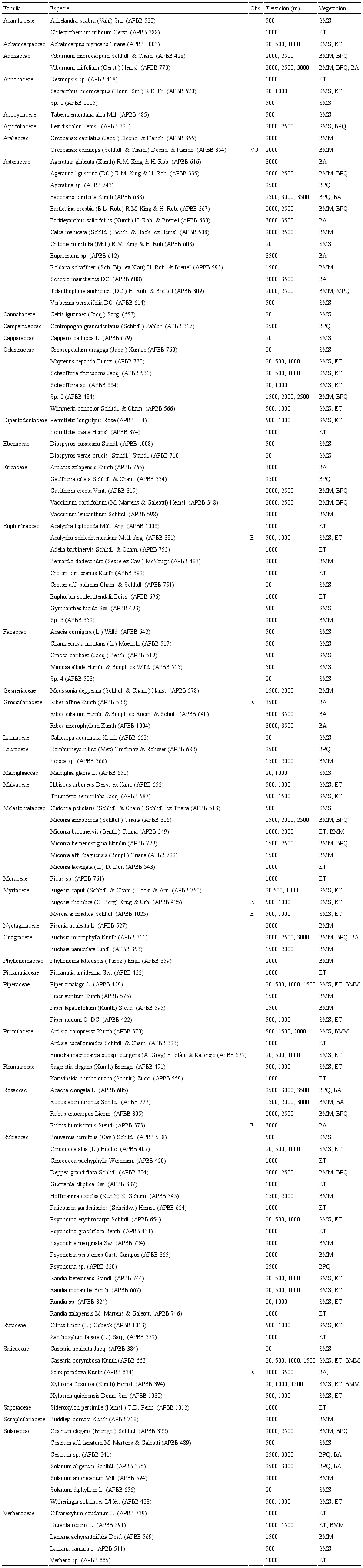 En las 120 parcelas de muestreo se registraron 118 especies y 14 morfoespecies de arbustos, agrupadas en 88 géneros y 41 familias (Apéndice). Los géneros con mayor número de especies fueron Miconia Ruiz & Pav. y Psychotria L. (cinco cada uno). La familia Rubiaceae es la más rica con 16 especies, seguida de Asteraceae (13) y Euphorbiaceae (nueve). Se registraron seis especies endémicas para México, de las cuales Acalypha schlechtendaliana Müll. Arg., Myrcia aromatica Schltdl. y Eugenia rhombea (O. Berg) Krug & Urb se encontraron en la selva mediana subcaducifolia de la elevación de 500 m y el encinar tropical de 1000 m, Salix paradoxa Kunth en el bosque de Pinus y Abies en elevaciones de 3000 y 3500 m, mientras que Rubus humistratus Steud. y Ribes affine Kunth se registraron únicamente en el bosque de Abies a los 3000 m.