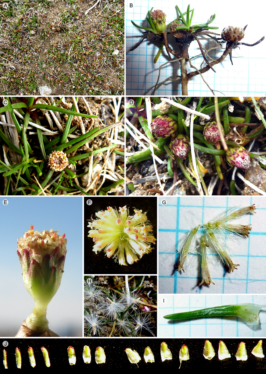 Perennial herb, rhizomatous, creeping, low-growing, forming mats 0.5-2 cm tall; plants with long pale subterraneous rhizomes; leaves sessile, rosette-forming, linear, 5-20 × 0.1-1 mm, sheathing at the base, apex obtuse, fleshy, margin entire, 3-veined at base (1-veined at lamina); synflorescences of solitary sessile terminal capitula, solitary at the apex of dense leaf rosettes; male capitula hemispherical, 4-7 mm long, receptacle without palea, flowers 20-35, involucres 4-6 × 3-5 mm, phyllaries 15-25 in 3-4 series, the outermost phyllaries narrowly ovate and acute, median phyllaries elliptic, broadly lanceolate or ovate, innermost phyllaries longer than outermost ones, linear-oblong, obtuse or subobtuse, all phyllaries whitish green, apically tinged with purple, phyllaries margin rather broadly scarious, short to long-dentate in the distal portion; corolla 3-4 mm long, tube 1.2-1.8 mm long, throat portion 1-1.5 mm long, campanulate, lobes 0.8-1.1 mm long, curved at maturity, pubescent in distal half, anther length double that of filaments; style not or slightly exceeding the corolla, sterile ovary glabrous, pappus with inconspicuously broadened bristles at apex, 2.4 mm long, bristles 25-50; female capitula hemispherical, 4-9 mm long, receptacle with linear palea, flowers 30-50, involucre 3-7 × 3-4 mm, cup shaped, phyllaries 25-40 in 2-4 series, such as the male; corollas 2.5-4.5 mm long, apex inconspicuously denticulate, style branches short but separate, achenes 1-2 mm long, 5-angled, glabrous, pappus 2-seriate, accrescent.