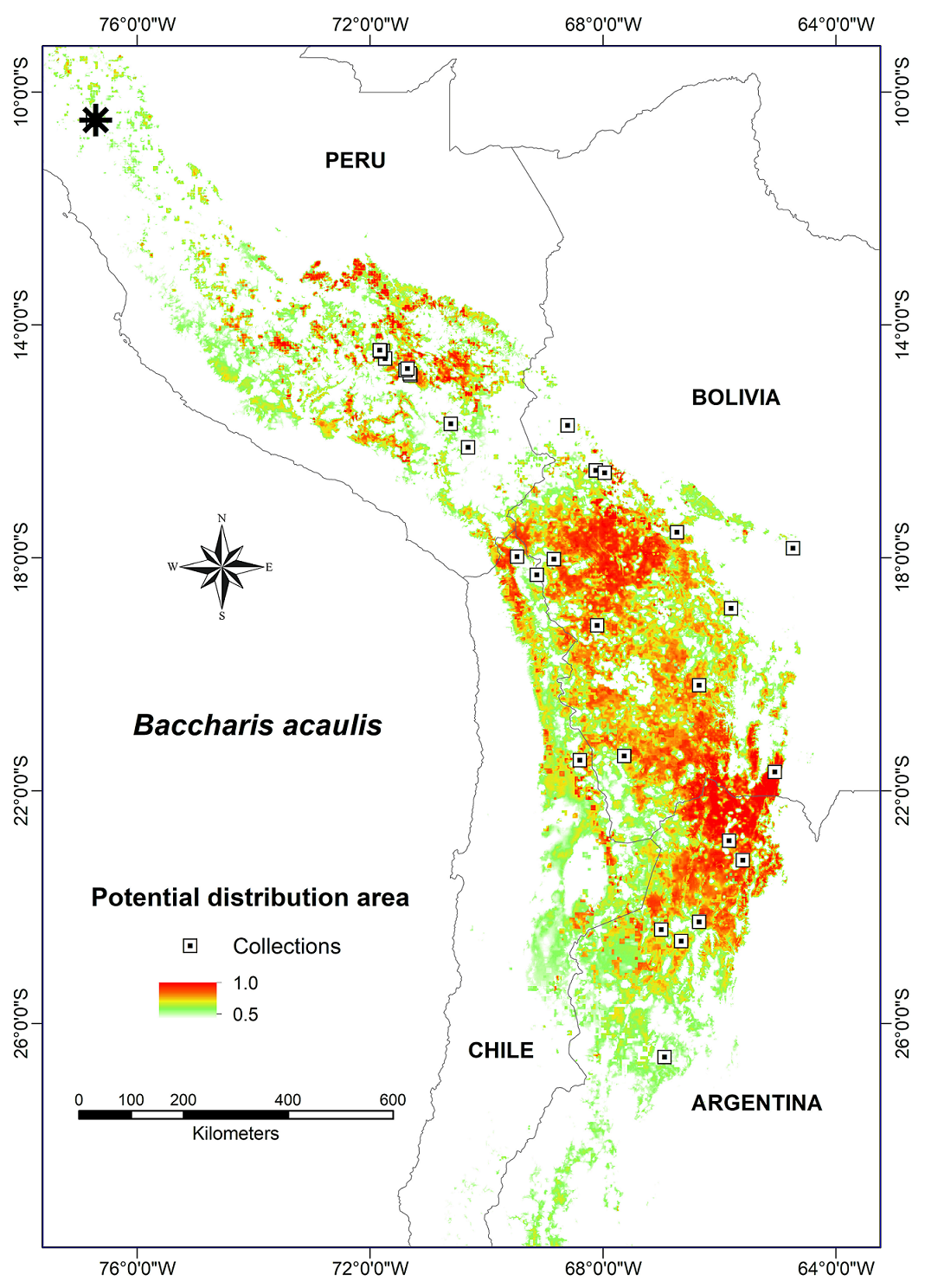 In Peru, the potential distribution model showed very suitable climatic conditions for B. acaulis in the departments of Cusco, Puno, Apurímac, Arequipa, Ayacucho, Moquegua, and Tacna (Fig. 2). The last five departments remain without confirming the presence of this species. In addition, it identified areas that are reasonably suitable towards central Peru, where in a recent expedition we recorded a population of Baccharis davidsonii Cuatrec. (Lima, Oyón, Raura, 4770 m, 17.X.2017, A. Cano et al. 22585 (USM), 22587 (USM)), a closely related species in Baccharis sect. Psila (Phil.) Cuatrec. (Heiden and Pirani, 2016). The model also predicted the presence of B. acaulis in Bolivia, Chile and Argentina, but in these countries, there are records of specimens for the regions (Chile), departments (Bolivia) or provinces (Argentina) where their potential distribution is predicted.