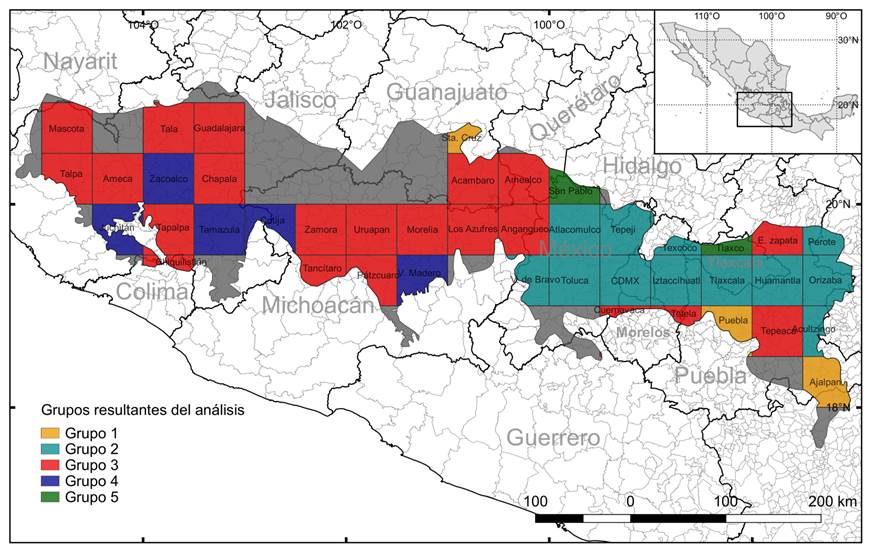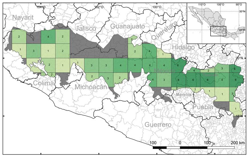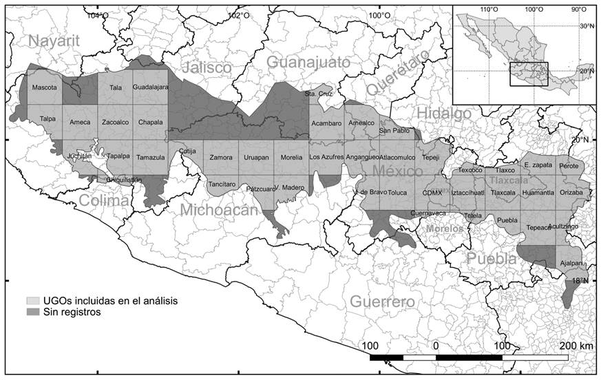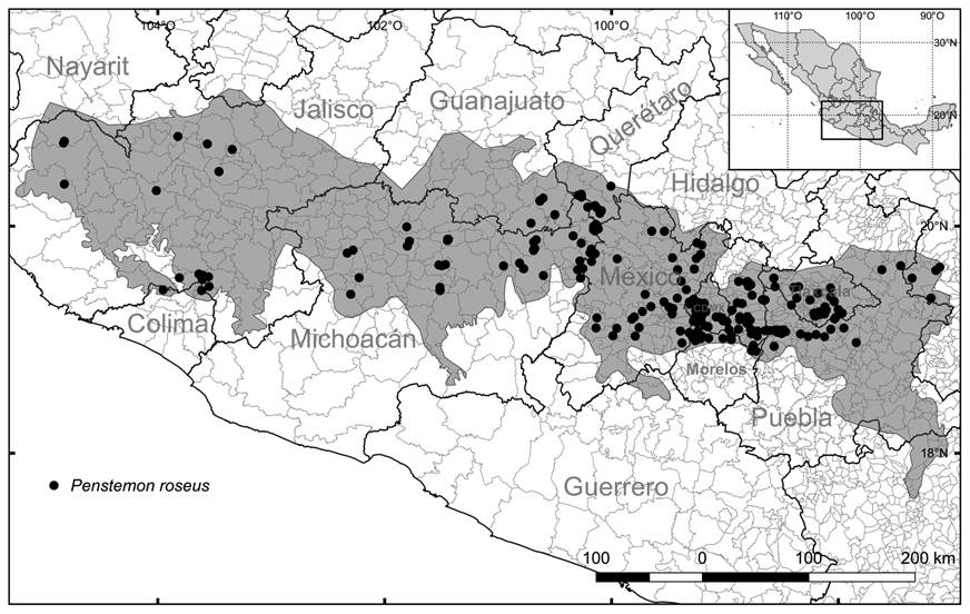 El área de estudio se delimitó utilizando el consenso para las provincias biogeográficas de México de la Comisión Nacional para el Conocimiento y Uso de la Biodiversidad (CONABIO, 1997); que corresponde con la descrita por Morrone et al. (2002) y abarca el territorio de 14 estados de la República Mexicana (Ciudad de México, Colima, Estado de México, Guanajuato, Hidalgo, Jalisco, Michoacán, Morelos, Nayarit, Puebla, Oaxaca, Querétaro, Tlaxcala y Veracruz).