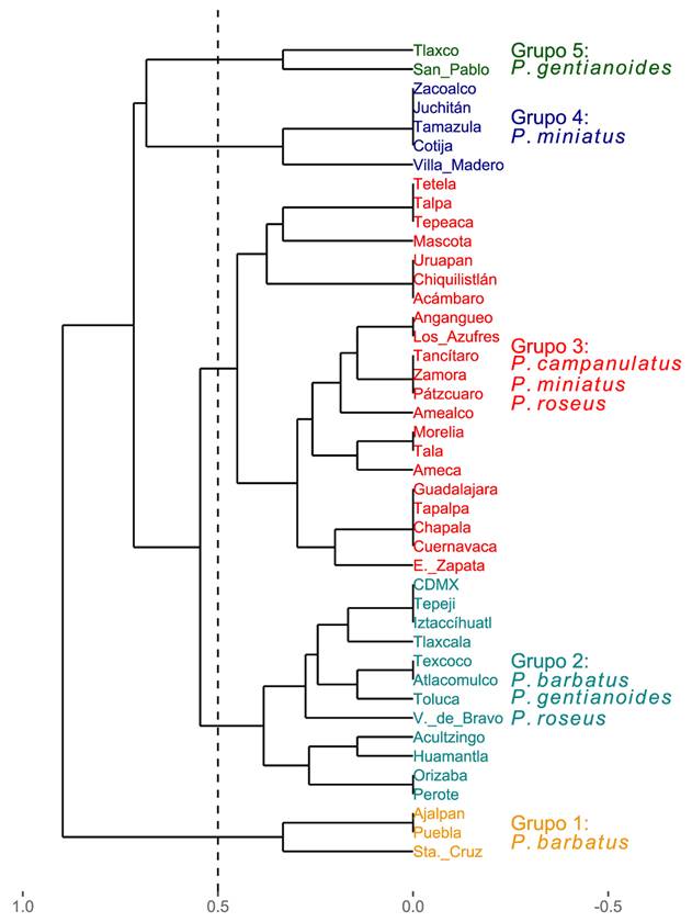 Los principales grupos observados en el análisis corresponden a las secciones oriental y centro-occidental de la FVTM. Otros autores han encontrado patrones similares utilizando diferentes grupos taxonómicos de animales (Escalante et al., 2007; Navarro-Sigüenza et al., 2007) y plantas (Suárez-Mota et al., 2013); sin embargo, en el caso del género Penstemon la delimitación de estos patrones es distinta a las previamente reportadas. Esto puede deberse a la relación que tienen sus especies con la altitud y a las diferencias en la altitud entre las diferentes partes de la FVTM. La baja riqueza existente en algunas unidades dificultó el análisis de agrupamiento y originó grupos de UGOs con especies compartidas pero separadas geográficamente. Los grupos mejor definidos en el análisis corresponden a los grupos 2 y 3; estos identifican dos patrones de distribución en las especies de Penstemon, uno corresponde con la sección oriental y el otro con la centro-occidental. Los límites entre estas secciones concuerdan con los encontrados por Torres y Luna (2007) entre los distritos orientales y los occidentales de la FVTM.