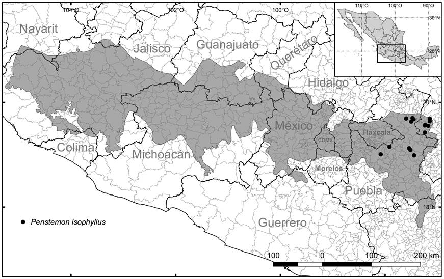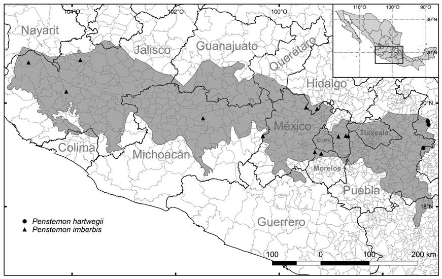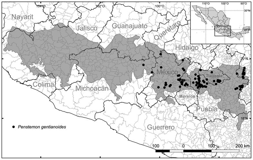 Conclusions: Although no endemic Penstemon taxa of the Trans-Mexican Volcanic Belt were found, it is important to note that the largest part of the distribution area of five of the nine treated taxa is concentrated in this province. Moreover, it was discovered that the eastern portion of the Trans-Mexican Volcanic Belt is the region where the largest species richness of the studied genus occurs.
