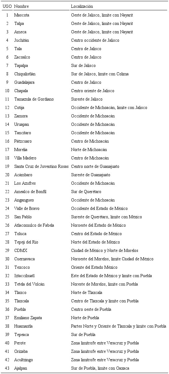 Después de dividir la FVTM en Unidades Geográficas Operativas (UGOs) se obtuvieron 75 unidades; las UGOs que no contenían ninguna especie se eliminaron del análisis, quedando sólo 43 UGOs, las cuales fueron numeradas siguiendo un orden de norte a sur y de oeste a este (Fig. 1). Posteriormente se les asignó un nombre de acuerdo con el municipio de mayor extensión ubicado en dicha UGO (Cuadro 1).