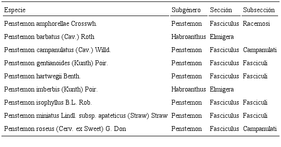 Como resultado de la investigación bibliográfica, de la revisión de cerca de 1500 ejemplares de herbario y de la consulta de bases de datos especializadas, se determinó que en la FVTM ocurren nueve taxa de Penstemon pertenecientes a los subgéneros Penstemon y Habroanthus (Cuadro 2), lo que equivale a cerca de 15% de las especies del género en México. A excepción de Penstemon barbatus y P. gentianoides, los taxa son endémicos del país. No se registraron taxones endémicos a la FVTM; sin embargo, en ésta ocurre gran parte del área de distribución conocida de P. gentianoides, P. hartwegii, P. imberbis (Kunth) Poir., P. isophyllus y P. miniatus subsp. apateticus.