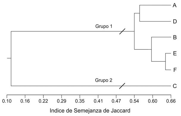 Para el análisis de la semejanza en la composición de especies entre municipios se construyó una matriz de datos de doble estado (presencia-ausencia), que incluyó todas las especies identificadas. Los resultados se muestran en un dendrograma, en el que la medida de semejanza fue el índice de Jaccard y el método de unión el de promedio entre grupos (UPGMA). Los datos se analizaron con el programa de cálculo PAST 3.01 (Hammer et al., 2001).