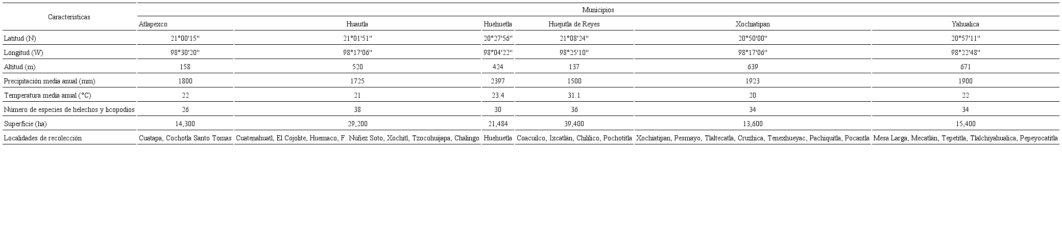 La zona de estudio se localiza en la región conocida como Huasteca Hidalguense, en el noreste del estado de Hidalgo y comprende seis municipios: Atlapexco, Huautla, Huehuetla, Huejutla de Reyes, Xochiatipan y Yahualica (Cuadro 1, Fig. 1). Su extensión territorial es de 1108.9 km², lo que representa 5.3% de la superficie del estado de Hidalgo (INEGI, 2000). Las coordenadas geográficas del área de estudio son: 20°50'00''-21°01'51'' latitud norte y 98°05'36''-98°30'20'' longitud oeste. La altitud oscila entre 137 y 671 m, la precipitación total anual entre 1500 y 2422 mm y la temperatura media anual entre 20 y 31.1 °C (Pavón y Meza-Sánchez, 2009; INEGI, 2010).