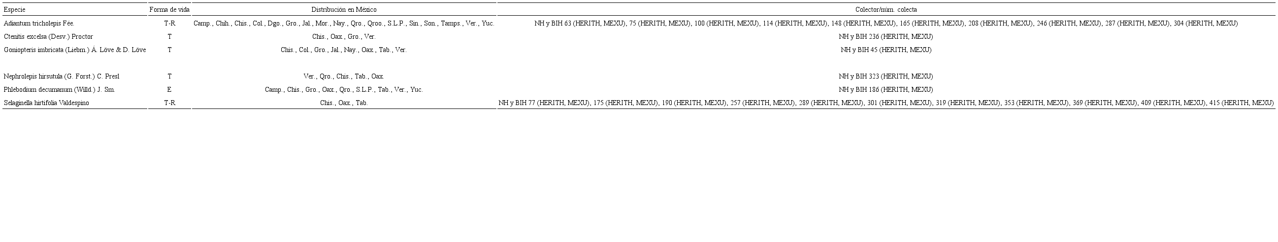 La mayoría de los estudios florísticos sobre Pteridofitas en México se han realizado en bosques templados (húmedos y subhúmedos) y en matorral xerófilo (Riba et al., 1996; Arreguín-Sánchez et al., 2001; Cerón-Carpio et al., 2006; Vázquez et al., 2006; Arreguín-Sánchez et al., 2009; Tejero-Díez et al., 2014; Sánchez-González et al., 2016). En cambio en todas las variantes de bosques tropicales, dichos estudios son escasos; los más sobresalientes son el de Riba y Pérez-García (1979) en un bosque tropical perennifolio (BTP sensuRzedowski, 1978) de Uxpanapa, Veracruz, el de Cetzal-Ix et al. (2013) en fragmentos de selva mediana subperennifolia (bosque tropical subcaducifolio (BTS sensuRzedowski, 1978) en el sur de Tabasco, el de Acebey et al. (2015), en la selva alta y mediana perennifolia (BTP y BTS, respectivamente) de la Reserva de la Biosfera Los Tuxtlas, Veracruz, el de Carvajal-Hernández y Krömer (2015), en la selva mediana subcaducifolia (BTS) de la región del Cofre de Perote, Veracruz, y el de Mendoza-Ruiz et al. (2017) en el bosque tropical caducifolio (BTC sensuRzedowski, 1978) y BTS de San Juan Colorado, Oaxaca.