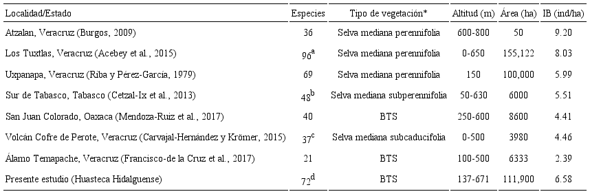 Los únicos estudios comparables realizados en otros estados de la república Mexicana (Cuadro 3), son los que se llevaron a cabo en la selva mediana perennifolia de Uxpanapa, Veracruz (Riba y Pérez-García, 1979), Atzalan, Veracruz (Burgos, 2009) y Reserva de la Biósfera Los Tuxtlas, Veracruz (Acebey et al., 2015); en la selva mediana subperennifolia del sur de Tabasco (Cetzal-Ix et al., 2013); en la selva mediana subcaducifolia de la parte baja del volcán Cofre de Perote, Veracruz (Carvajal-Hernández y Krömer, 2015); y en el BTS de San Juan Colorado, Oaxaca (Mendoza-Ruiz et al., 2017) y de Álamo Temapache, Veracruz (Francisco-de la Cruz et al., 2017). Los tres tipos de selva mediana (perennifolia, subperennifolia y subcaducifolia) incluidos en la comparación, se consideraron afines o semejantes al BTS (sensuRzedowski, 1978).