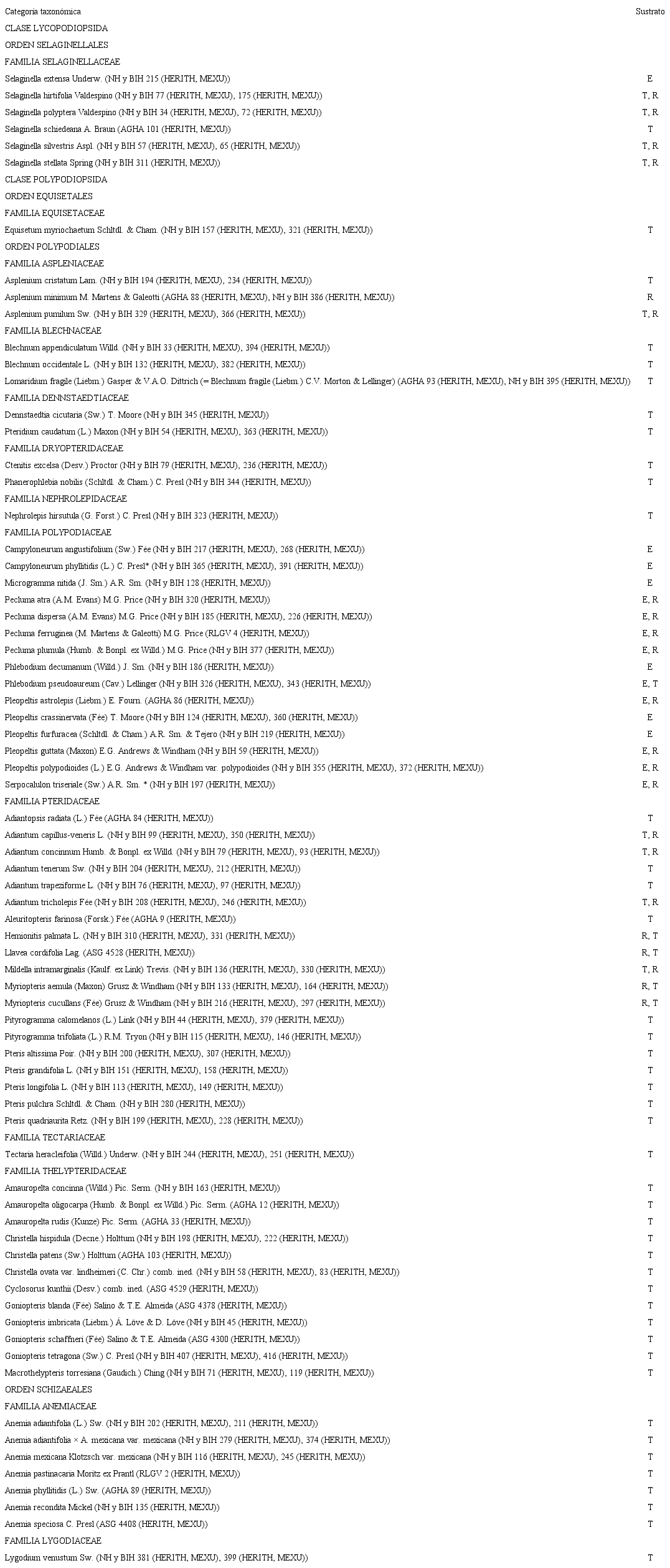 La determinación taxonómica fue a nivel de especie, con base en la obra de Mickel y Smith (2004). En el listado florístico se consideró la clasificación de PPG I (2016); la nomenclatura y los nombres de los autores fueron actualizados de acuerdo con las bases de datos IPNI (2018) y TROPICOS (2018). Adicionalmente, se consultó la literatura más reciente para la nomenclatura de algunos taxones (Wilbur y Whitson, 2005; Salino et al., 2015; Almeida et al., 2016). Se recolectaron al menos dos ejemplares de cada especie (duplicados), para integrar dos juegos, uno de ellos se depositó en el Herbario Nacional de México (MEXU) y el otro en el Herbario del Instituto Tecnológico de Huejutla (HERITH), registrado en la Dirección General de Vida Silvestre: FLO-128-0402.