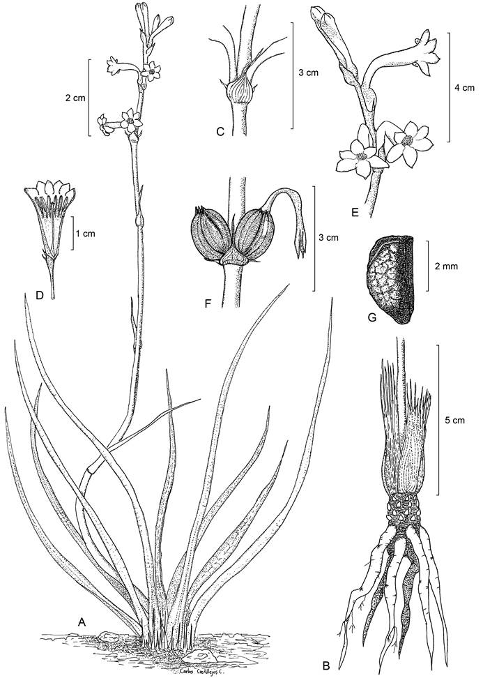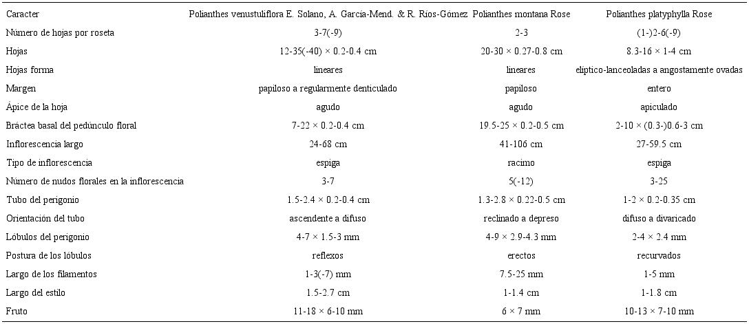 Para decidir el estatus de las plantas como especie nueva, los caracteres cuantitativos y cualitativos analizados, se compararon con los de Polianthes montana Rose y P. platyphylla Rose, especies que tienen similitudes morfológicas con la especie nueva (Figs. 1A-D). Asimismo, se revisaron los protólogos, los tipos nomenclaturales y ejemplares de herbario procedentes de las colecciones ENCB, FEZA, IEB, MEXU, MICH y US, de estas especies.