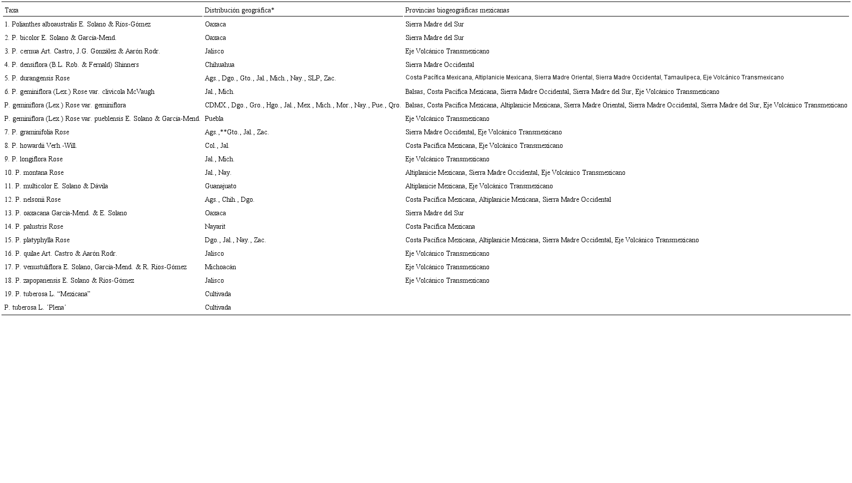 Polianthes está conformado por 19 especies, incluida la que aquí se describe, tres taxa infraespecíficos y dos cultivares (Cuadro 1). Se distribuye desde el sur de Chihuahua y Tamaulipas, hasta el centro-sur de Oaxaca (García-Mendoza y Solano, 2007; Solano y Feria, 2007; Solano y Ríos Gómez, 2014). Solano y Feria (2007) señalaron que las provincias biogeográficas, propuestas por Morrone (2005), con la mayor riqueza de especies de Polianthes son la Sierra Madre Occidental y el Eje Volcánico Transmexicano, con siete y nueve especies, respectivamente. A esta última provincia se agregan dos especies descritas recientemente: P. cernua Art. Castro, J.G. González & Aarón Rodr., y P. quilae Art. Castro & Aarón Rodr., endémicas del occidente de Jalisco (Castro-Castro et al., 2015; 2016). La única especie cultivada es Polianthes tuberosa L., y se usa ampliamente en el mundo como ornamental y ceremonial desde la época prehispánica (Cuadro 1).