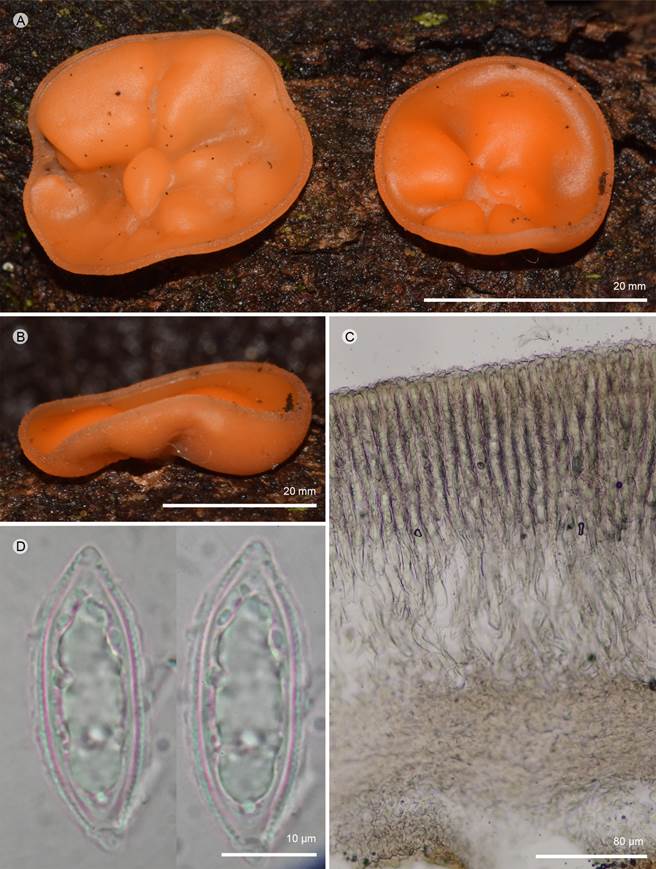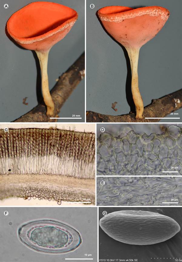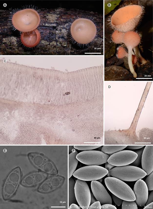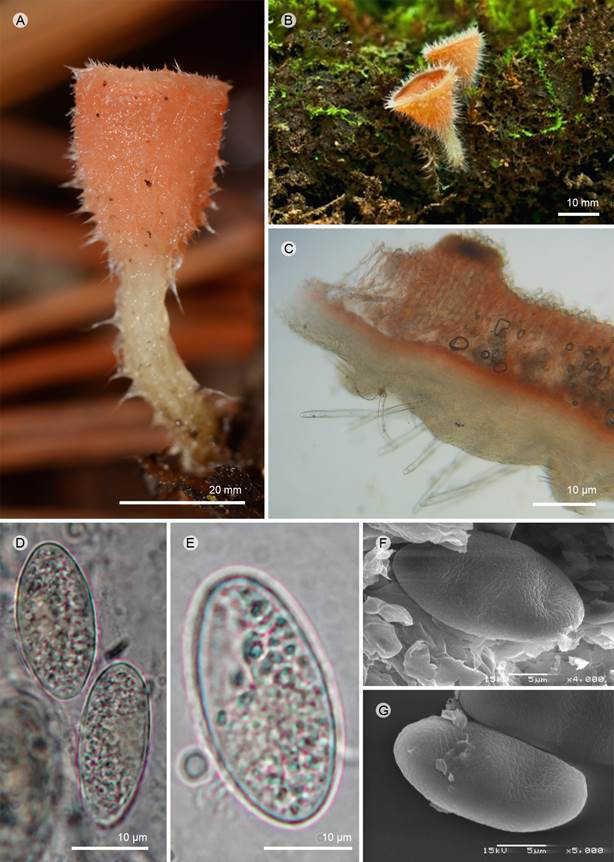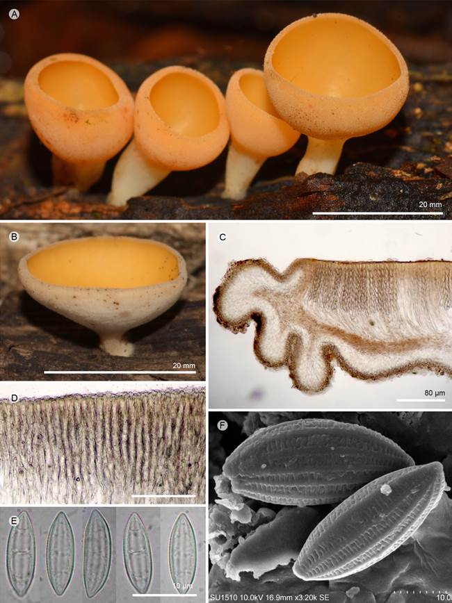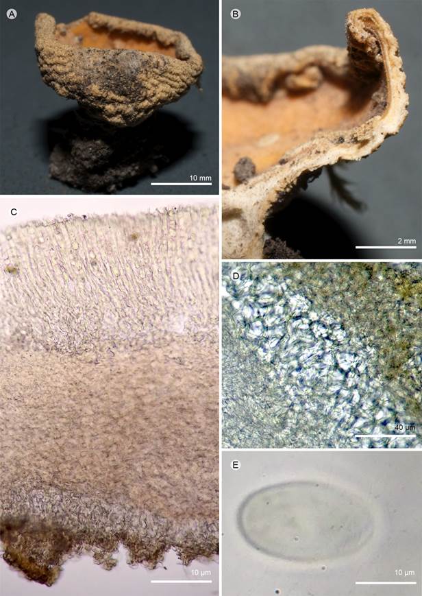 Apotecios 10-20 mm de diámetro, cupuliformes, estipitados, color naranja-grisáceos (6B5-4) en fresco; estípite 20-30 × 3-4 mm, cilíndrico, central, simple o ramificado, agrupándose 2-4 apotecios en las ramas, consistencia cartilaginosa; superficie himenial lisa, color naranja-grisáceo (6B5-4), superficie exterior color marrón oscuro (6F6-7), rugosa, con escasos pelos cortos, más abundantes y largos en el margen; pelos 200-800 × 12-20 µm, color marrón (6F6), originándose en el excípulo ectal, formados por paquetes de 4-8 hifas, marrón obscuras, paredes gruesas, 3-7 µm de diámetro; excípulo ectal 72-120 µm de grosor, textura angular a epidermoidea, células 4-16 × 3-8 µm, color naranja-marrón (6C6); excípulo medular 160-240 µm de grosor, textura intrincada, hifas de 5-7 µm de ancho, septadas, hialinas; subhimenio no es evidente; paráfisis 1-2 µm de ancho en la parte media, cilíndricas, subclavadas hacia el ápice, 3-4 µm de diámetro; ascas 350-400 × 15-18 µm, cilíndricas, pared 1-2 µm de grosor, estrechándose hacia la base, suboperculadas, octospóricas; ascosporas 24-28 (-30) × 11-14 µm (x=30 × 13 µm, n=30), considerando la ornamentación, elipsoidales, inamiloides, uniseriadas, hialinas, se observa una gútula central en el MO; en el MEB, ornamentación con crestas 2-3 µm de alto, longitudinales y transversales que se anastomosan para formar un retículo, alveolos 9-12 × 2.4-4.5 µm, irregulares en forma.