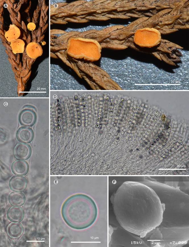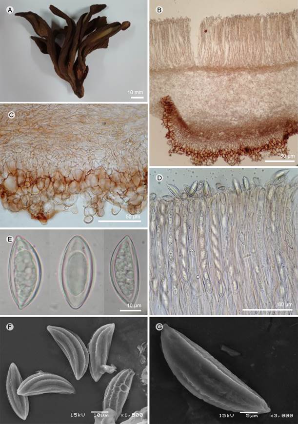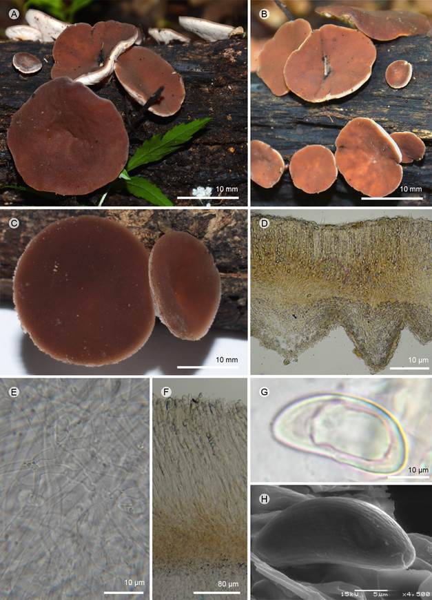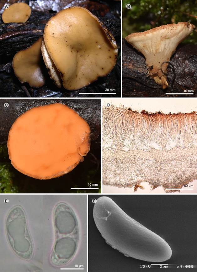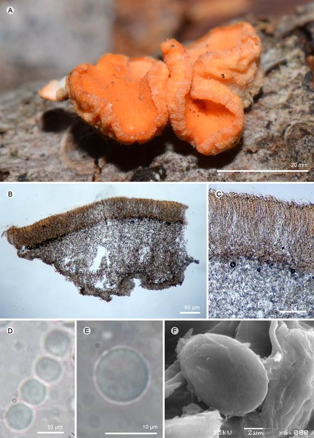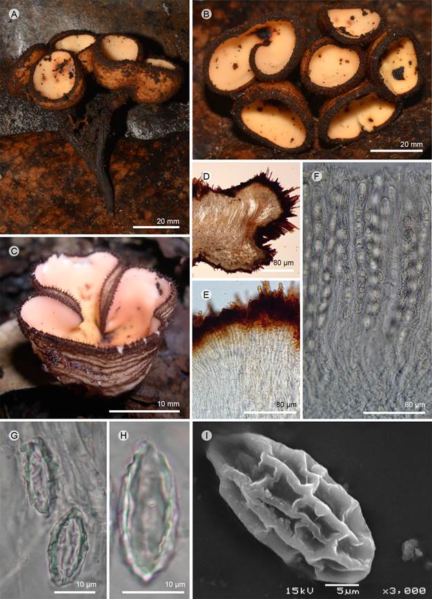 Apotecios 10-20 mm de diámetro, cupuliformes, estipitados, color naranja-grisáceos (6B5-4) en fresco; estípite 20-30 × 3-4 mm, cilíndrico, central, simple o ramificado, agrupándose 2-4 apotecios en las ramas, consistencia cartilaginosa; superficie himenial lisa, color naranja-grisáceo (6B5-4), superficie exterior color marrón oscuro (6F6-7), rugosa, con escasos pelos cortos, más abundantes y largos en el margen; pelos 200-800 × 12-20 µm, color marrón (6F6), originándose en el excípulo ectal, formados por paquetes de 4-8 hifas, marrón obscuras, paredes gruesas, 3-7 µm de diámetro; excípulo ectal 72-120 µm de grosor, textura angular a epidermoidea, células 4-16 × 3-8 µm, color naranja-marrón (6C6); excípulo medular 160-240 µm de grosor, textura intrincada, hifas de 5-7 µm de ancho, septadas, hialinas; subhimenio no es evidente; paráfisis 1-2 µm de ancho en la parte media, cilíndricas, subclavadas hacia el ápice, 3-4 µm de diámetro; ascas 350-400 × 15-18 µm, cilíndricas, pared 1-2 µm de grosor, estrechándose hacia la base, suboperculadas, octospóricas; ascosporas 24-28 (-30) × 11-14 µm (x=30 × 13 µm, n=30), considerando la ornamentación, elipsoidales, inamiloides, uniseriadas, hialinas, se observa una gútula central en el MO; en el MEB, ornamentación con crestas 2-3 µm de alto, longitudinales y transversales que se anastomosan para formar un retículo, alveolos 9-12 × 2.4-4.5 µm, irregulares en forma.