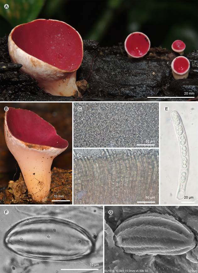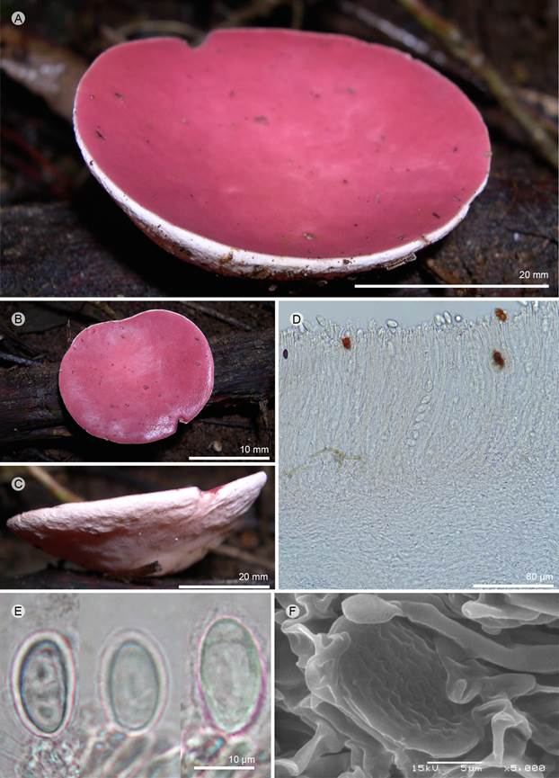 Apotecios 20-35 mm de diámetro, cupuliformes o discoidales, sésiles o pseudoestipitados, color rubí oscuro (12F8); pseudoestípite 15-30 × 4-6 mm, cilíndrico a ventricoso, color blanquecino, liso; superficie himenial lisa, color rubí oscuro (12F8) a magenta oscuro (13F8), superficie exterior blanquecina (9A2), lisa, margen entero, glabro; excípulo ectal 40-80 µm de grosor, textura epidermoidea a prismática, células 14-16 × 8-10 µm, pared 1 µm de grosor; excípulo medular 100-200 µm de grosor, textura intrincada, hifas 1-4 µm de diámetro, septadas; subhimenio no es evidente; paráfisis 2-3 µm de diámetro, ápice 3-5 µm de diámetro, cilíndricas a subclavadas, simples, no ramificadas, septadas; ascas 360-400 × 14-18 µm, cilíndricas, estrechándose hacia la base, hialinas; ascosporas 22-30 × 12-13 µm, (x=26 × 13 µm, n=30), elipsoidales a fusoides, hialinas, inequilateras, los extremos agudos, uniseriadas, pared 2 µm de grosor; en el MEB, ornamentación presenta 12-14 estriaciones longitudinales, paralelas a lo largo de la espora.