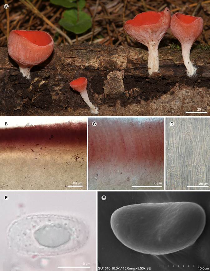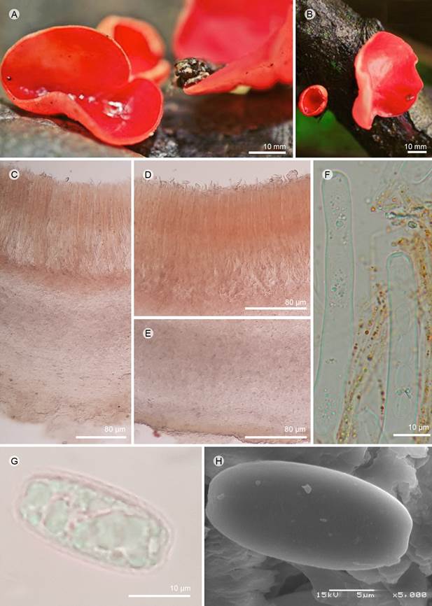 Apotecios 10-40 × 10-20 mm, cupuliformes a discoides, sésiles a subestipitados, color rojo intenso (10A8) a rojo pastel (9A4) en fresco; subestípite 20-40 × 10-15 mm, blanquecino, liso a ligeramente tomentoso, adelgazando hacia la base; superficie himenial lisa, rojo escarlata (9A8) a rojo (9A6), decolorando a rojo anaranjado (7A7), lisa, borde crenulado, superficie exterior blanquecina, lisa a tomentosa; pelos proyectados al exterior, rectos y paralelos o ligeramente flexuosos, 4-5 µm de ancho; excípulo ectal 20-40 µm de grosor, textura porrecta, células 3-4 × 2-3 µm de ancho; excípulo medular 150-280 µm de espesor, textura intrincada, hifas 2-3 µm de diámetro, septadas, contenido granular de color rojo rosado (9A6); subhimenio no es evidente; paráfisis 2-3.5 µm de diámetro, cilíndricas ligeramente ensanchadas hacia la base, de la misma longitud de las ascas sin sobresalir de ellas, con pigmentos carotenoides rojizos (8A6); ascas 240-300 × 13-16 µm, cilíndricas, estrechas hacia la base, hialinas, suboperculadas; ascosporas 24-34 × 11-14 µm (x=28 × 12 µm, n=30), cilíndricas-elipsoidales, no truncadas, hialinas, lisas, con dos gútulas en los extremos, capa gelatinosa que las envuelve, uniseriadas.