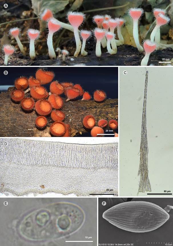 Apotecios 15-35 mm de diámetro, cupuliformes, estipitados, ornamentados, color rojo vivido a rojo escarlata (9A6-8) en fresco; estípite 35-55 × 2-4 mm, cilíndrico, central, color blanquecino (9A1), engrosándose hacia la parte superior, con pelos blanquecinos; superficie himenial lisa, color rojo vivido a rojo escarlata (9A6-8), superficie exterior concolora al himenio, con pelos blanquecinos, margen incurvado y borde pubescente; pelos 2000 × 40-50 μm en el ápice, 80-110 μm de ancho hacia la base, blanquecinos (9A1), densos en el margen, formados por cuatro o más hifas paralelas, se originan principalmente en el excípulo ectal, algunos en el excípulo medular; excípulo ectal 200-300 µm de grosor, textura globular, células 14-15 µm, pared 1 µm de grosor, color amarillento o amarillo-grisáceo (4B5); excípulo medular 200-350 µm de grosor, textura intrincada, hifas de 4-5 µm de diámetro, septadas, anastomosadas, hialinas o ligeramente amarillentas (4A4); subhimenio no es evidente; paráfisis 2-2.5 µm de ancho en la parte media, cilíndricas, simples o bifurcadas, septadas, anastomosadas; ascas 300-350 × 17-19 µm, cilíndricas, estipitadas, 15-20 × 1.5-2 µm en la base, pared 3 µm de grosor, suboperculadas, inamiloides, octospóricas; ascosporas 27-32 × 12-13 µm (x=30 × 13 µm, n=30) fusoides, cilíndricas, citriformes a elipsoidales, hialinas, inamiloides, uniseriadas, pared 1 µm de grosor, 1-2 gútulas; en el MEB, ornamentación presenta 15-20 estrías delgadas, longitudinales y paralelas entre sí.
