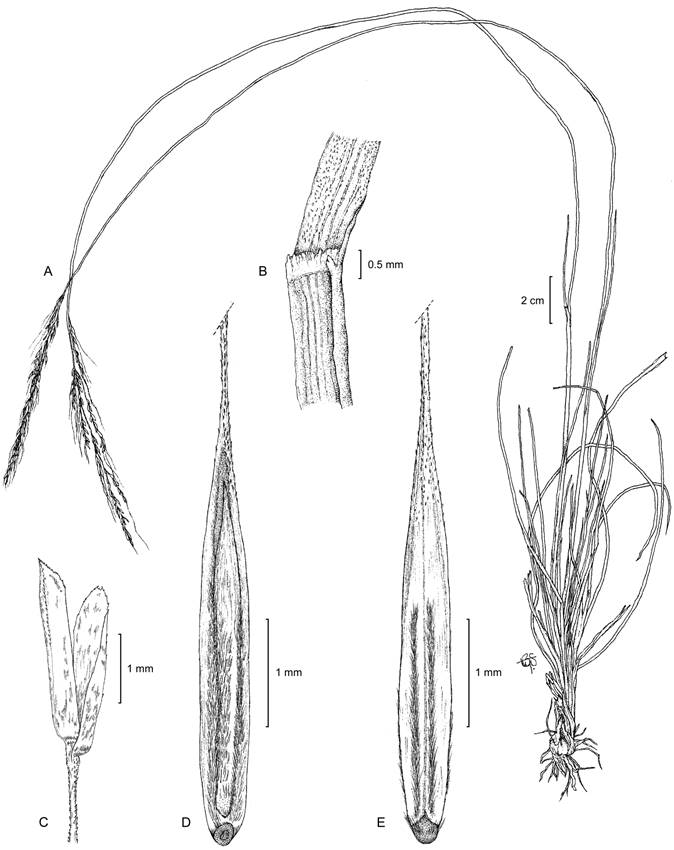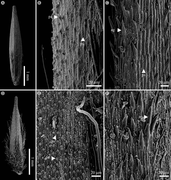Micromorfología de la lema: células epidérmicas intercostales ca. tres veces más largas que anchas, paredes anticlinales longitudinales engrosadas, de forma sinuosa; papilas presentes, posición distal; aguijones con base elíptica, presentes hacia el ápice; macropelos presentes en el callo, hacia la nervadura media y márgenes (Fig. 3).