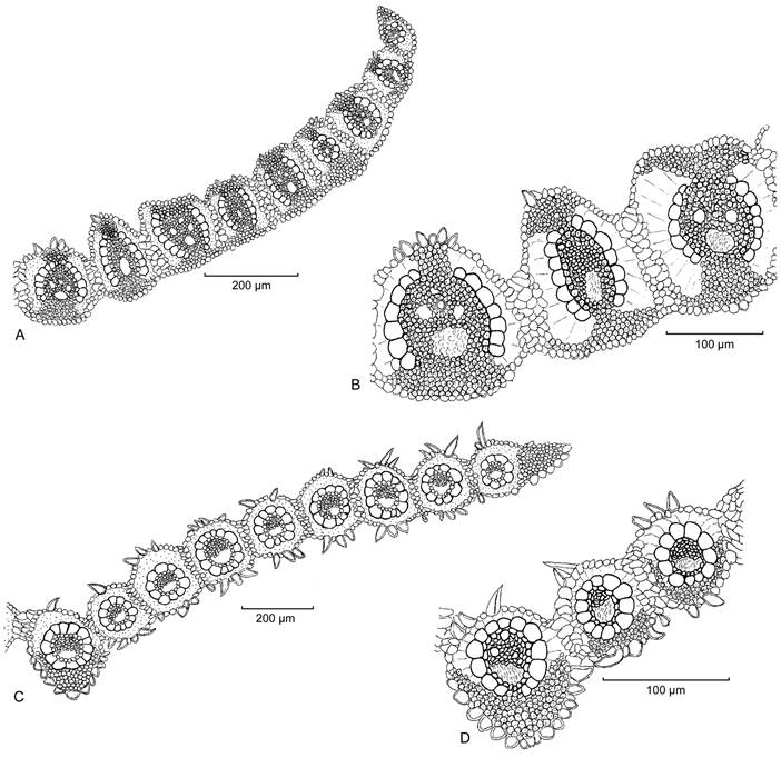 Anatomía de la lámina: lámina aplanada o involuta en corte transversal; costilla media ausente; surcos adaxiales más profundos que los abaxiales, células parenquimatosas incoloras presentes por debajo; haces vasculares elípticos; haces primarios 7, vaina de parénquima interrumpida adaxial y abaxialmente, esclerénquima adaxial y abaxial; 1 haz secundario entre los primarios, más pequeños, vaina de parénquima interrumpida adaxial y abaxialmente, esclerénquima adaxial y abaxial; haces vasculares terciarios ausentes; margen con poco esclerénquima; epidermis adaxial papilosa y escabriúscula; epidermis abaxial glabra (Fig. 2).