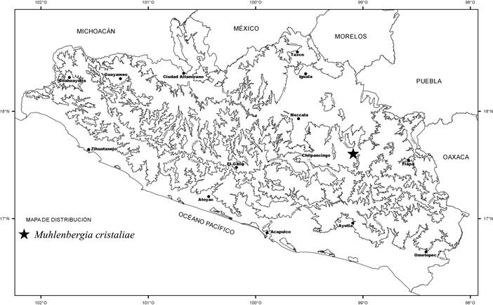 Conclusions: Muhlenbergia cristaliae is considered endemic to Guerrero, without sufficient data to evaluate its conservation status for now.