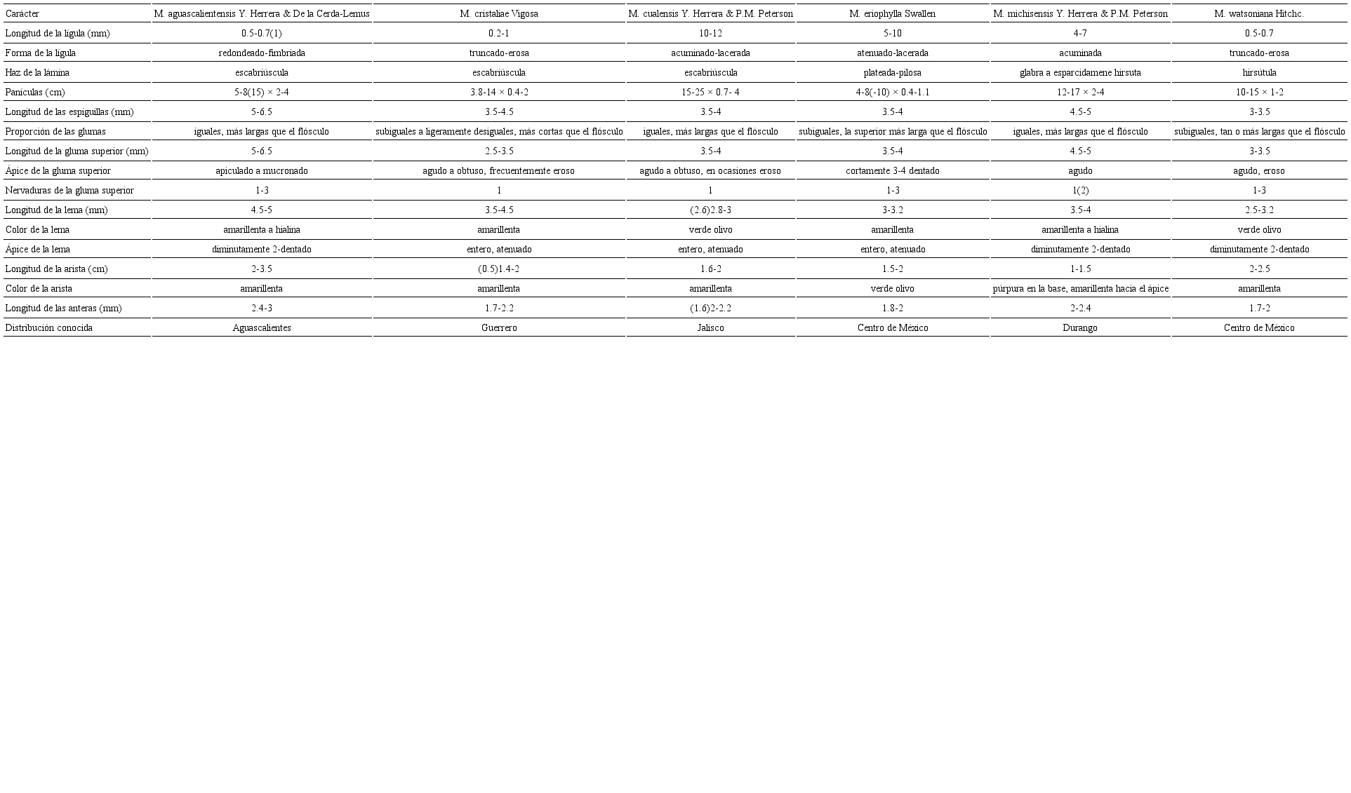 También se observaron lemas de la nueva especie y de M. watsoniana con microscopia electrónica de barrido. Se tomaron muestras de lemas a partir de material de herbario, se montaron en portamuestras de aluminio exponiendo la superficie abaxial de la lema. Las muestras se cubrieron con una capa de oro en un ionizador (Denton Vacuum Desk II, Moorestown, Nueva Jersey, EUA). La observación y toma de fotografías se realizó en un microscopio electrónico de barrido (Jeol JSM 5310LV, Peabody, Massachusetts, EUA).