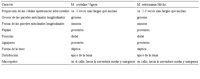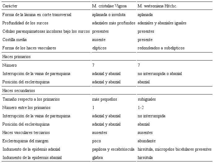 Se estudió la anatomía de la lámina foliar tanto de la nueva especie como de M. watsoniana Hitchc., a partir de material obtenido de ejemplares de herbario. Se tomaron muestras de la porción media de hojas maduras, a la mitad del tallo. Las muestras de hoja fueron rehidratadas en agua a ca. 100 °C y se realizaron cortes a mano. Los cortes se tiñeron con azul de toluidina durante ca. 1 minuto y se montaron en gelatina glicerinada para su observación en un microscopio óptico (Carl Zeiss Axiostar Plus, Göttingen, Alemania).
