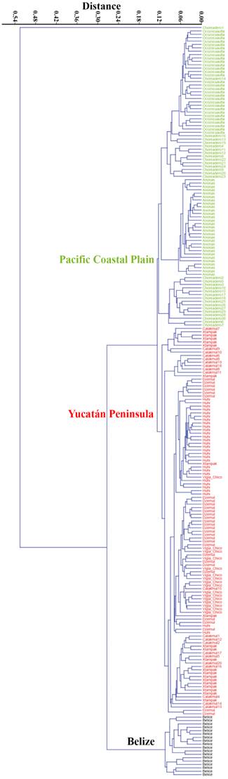 The dendogram based on the qualitative and quantitative characters employed showed three main clusters: the first represented by the Belize specimens (black cluster), the second those of the Yucatán Peninsula (red cluster), and the third cluster (green) the specimens of Chiapas and Oaxaca (Pacific Coastal Plain) (Fig. 2).